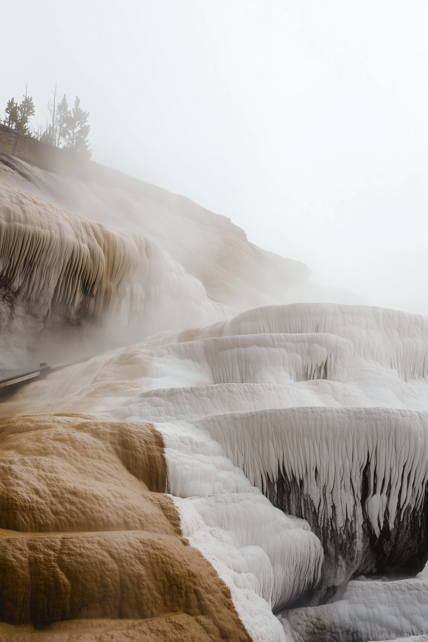 Ethereal terraced mineral formations with mist rising, creating a mystical landscape of white and brown hues.