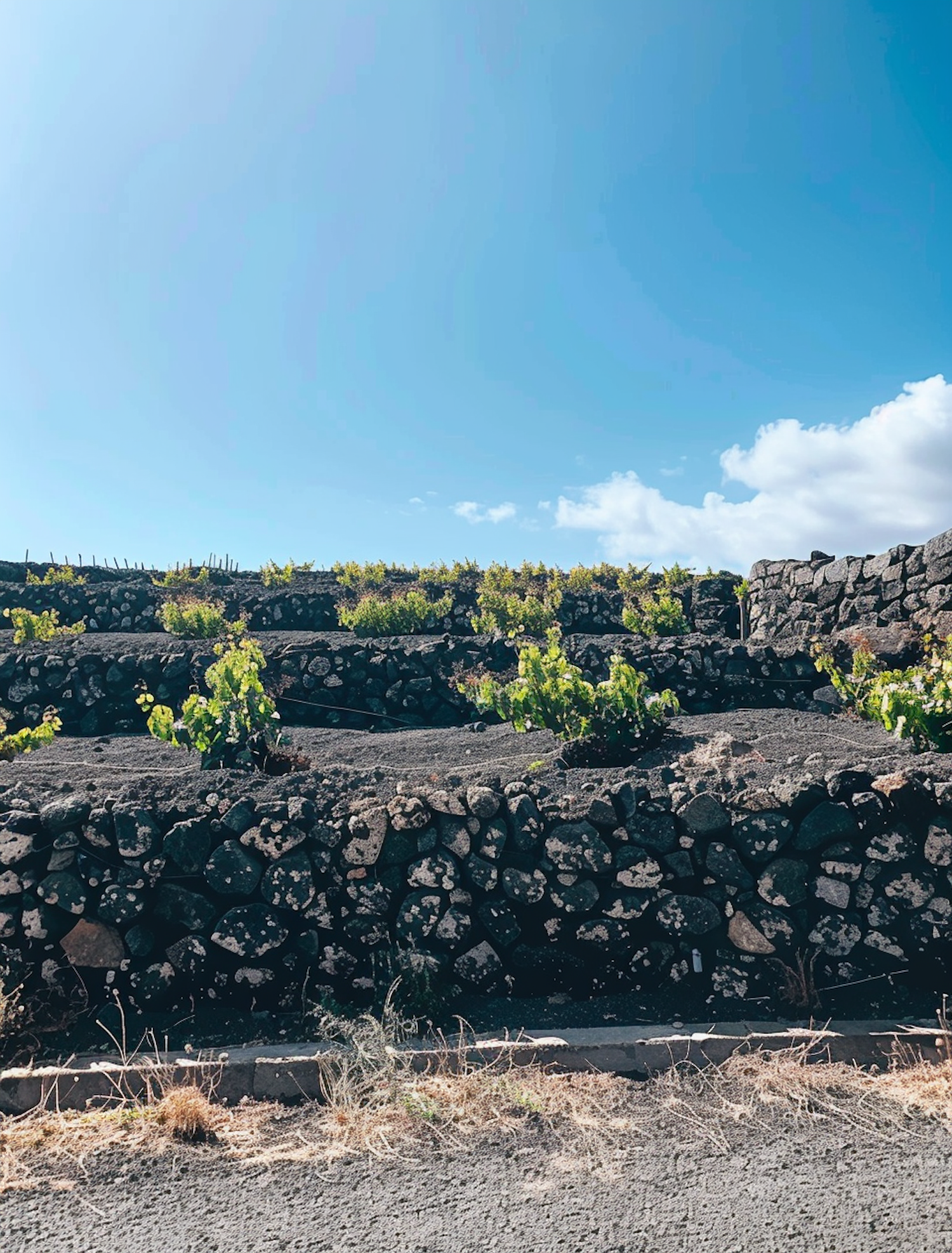 Terraced landscape with stone walls and green plants under a clear blue sky, showcasing traditional agricultural practices.