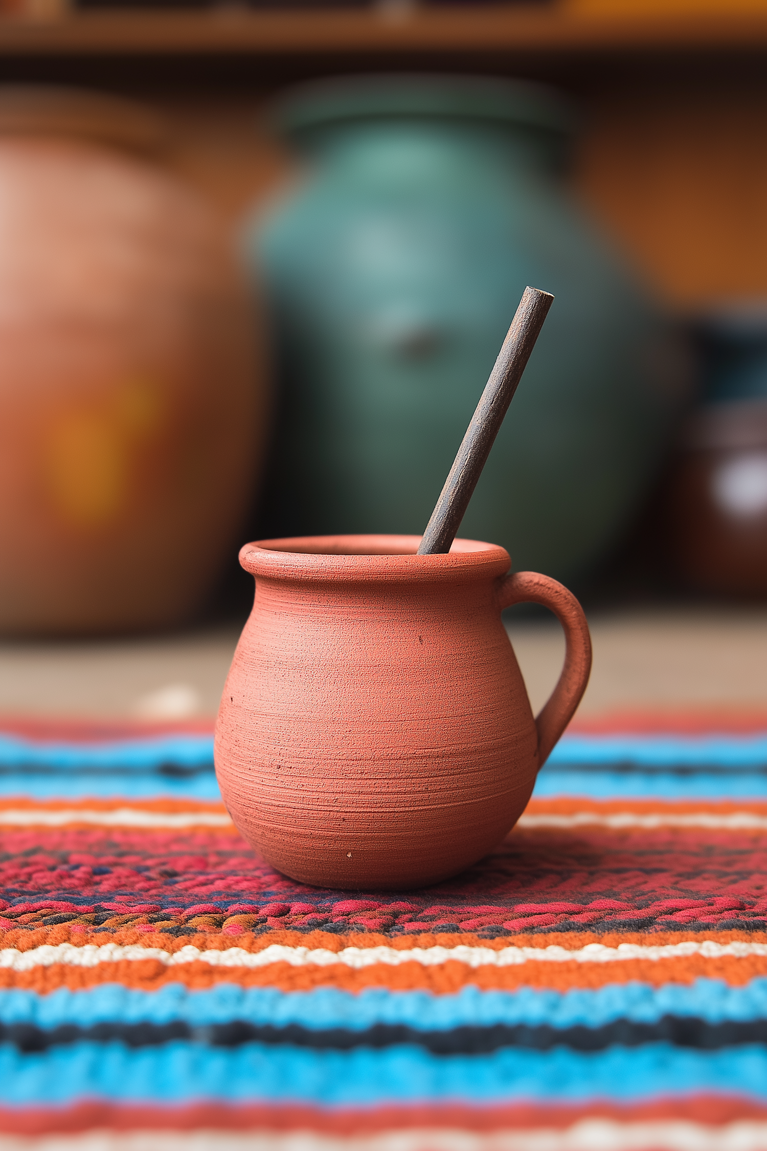 Rustic terracotta mug with a wooden stick on a colorful woven textile, surrounded by blurred pottery in the background.