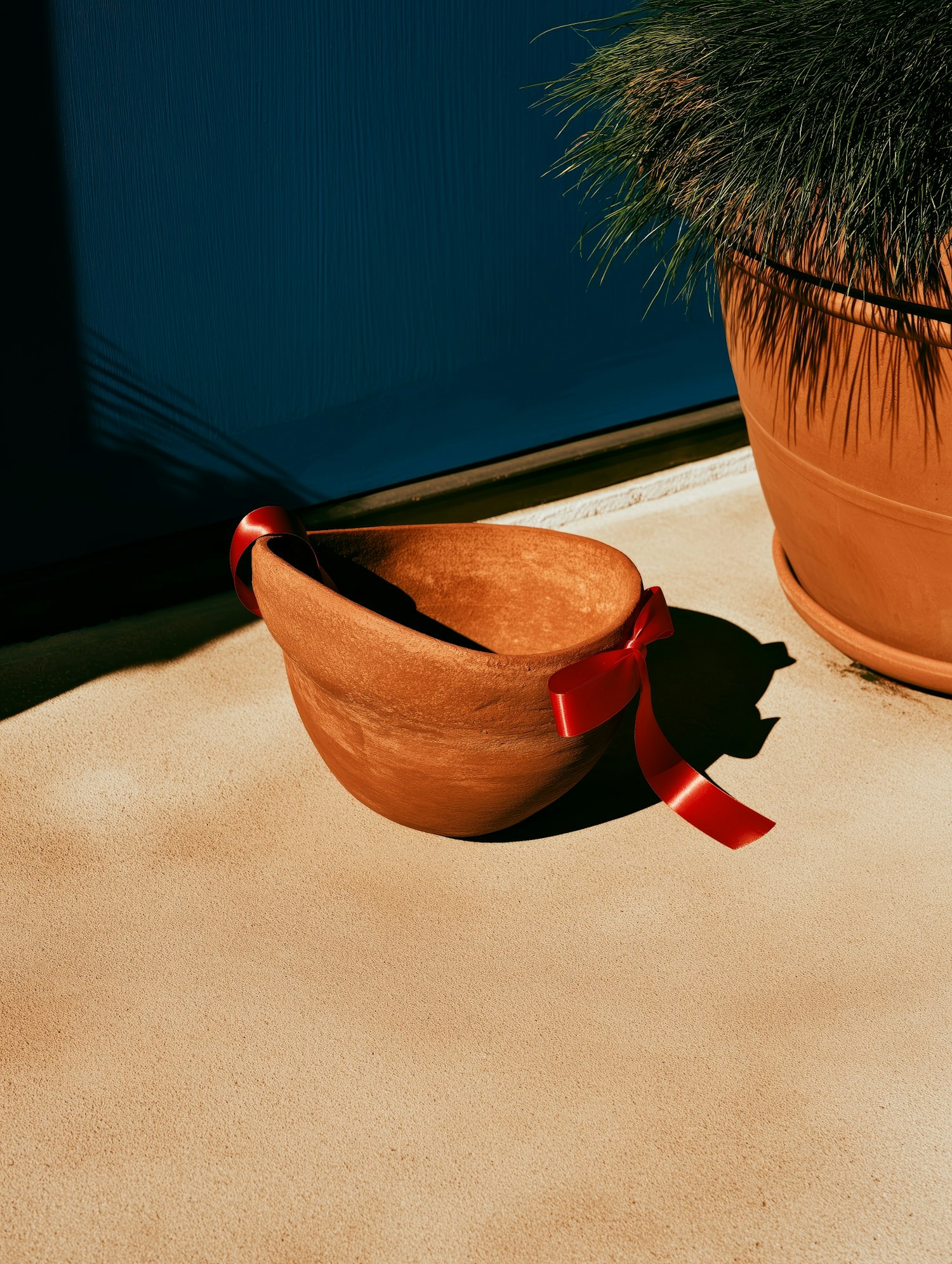 Terracotta pot with a red ribbon on a sunny patio, next to a larger pot with green plants, against a blue wall.