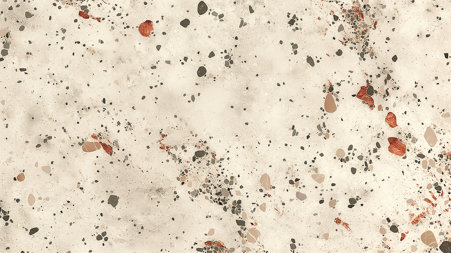 Terrazzo pattern with cream background and scattered gray, black, and reddish-brown fragments. Modern and rustic design.