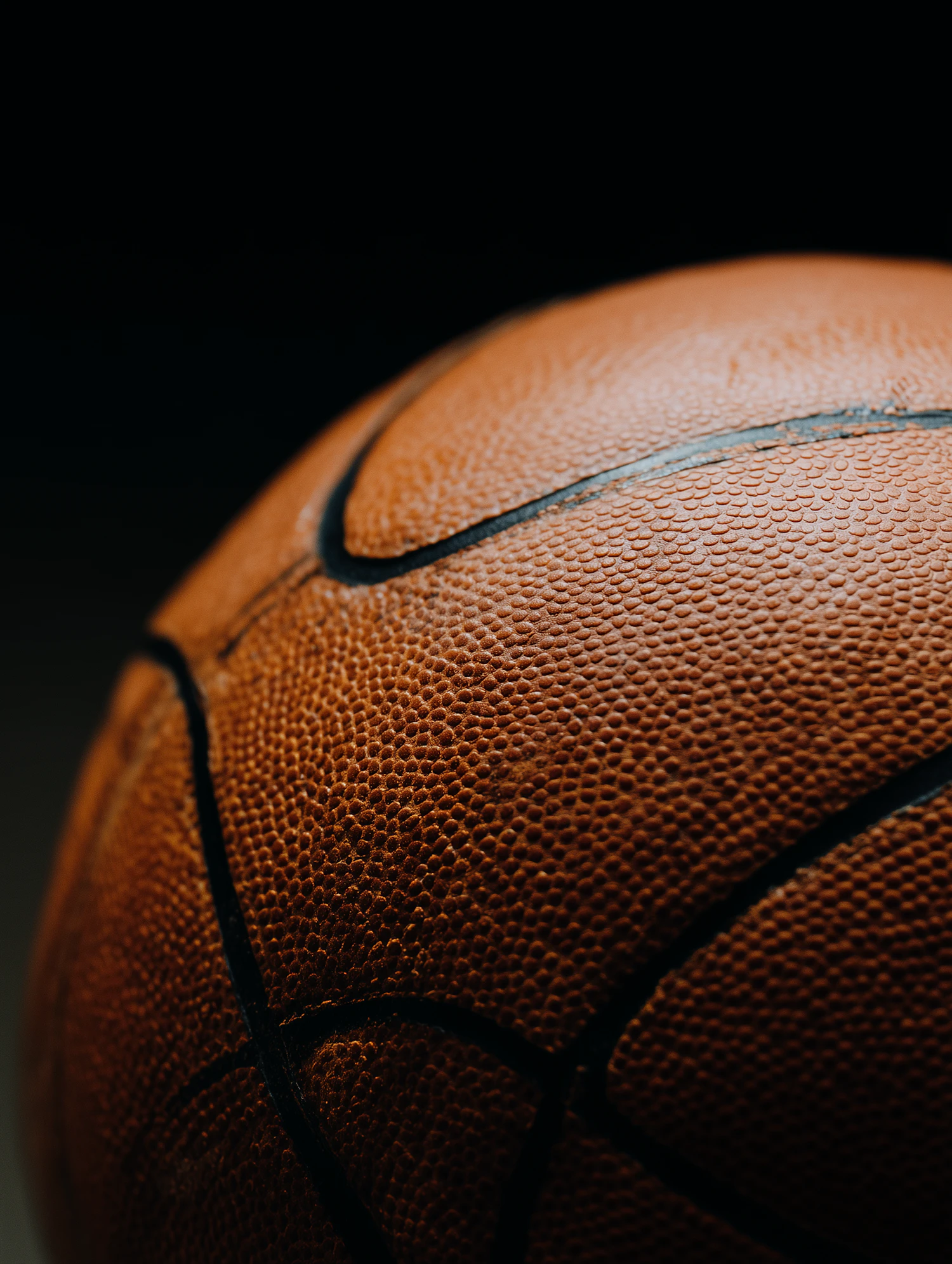 Close-up of a basketball's textured surface with dramatic lighting and a dark background, emphasizing its details and design.