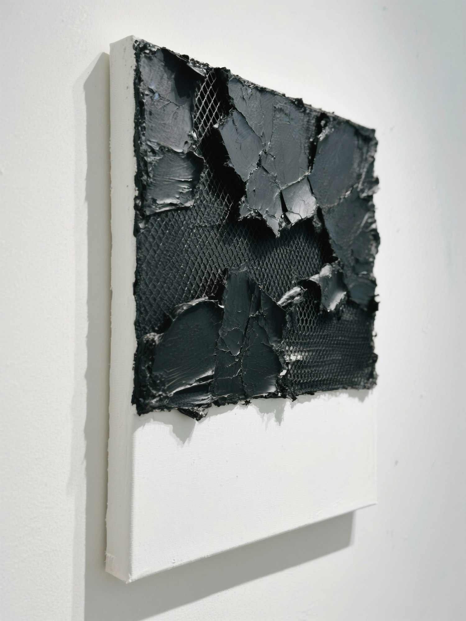 Modern art piece with textured black material on a white canvas, featuring a rugged, three-dimensional design with mesh patterns.