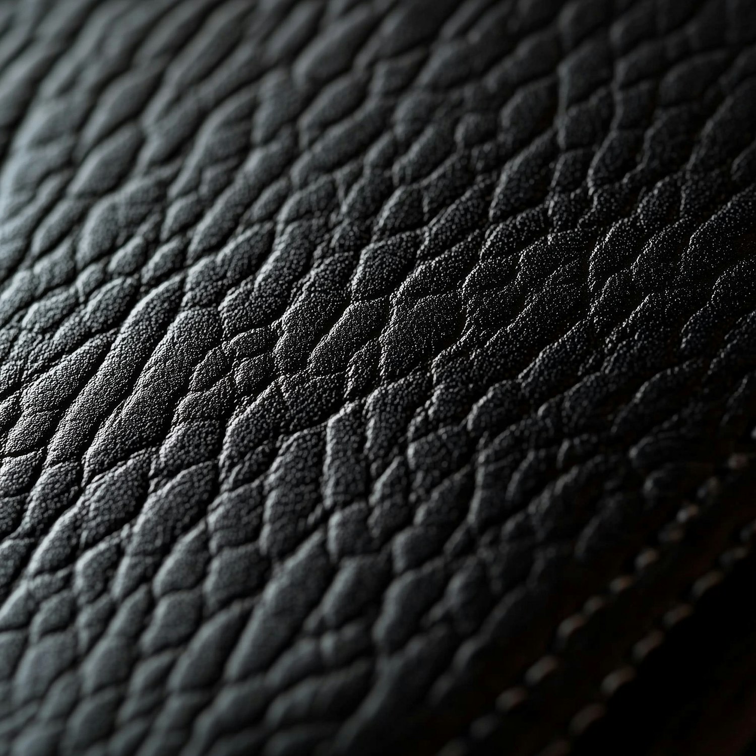 Close-up of textured black leather with intricate grain and visible stitching, highlighting its luxurious and durable appearance.