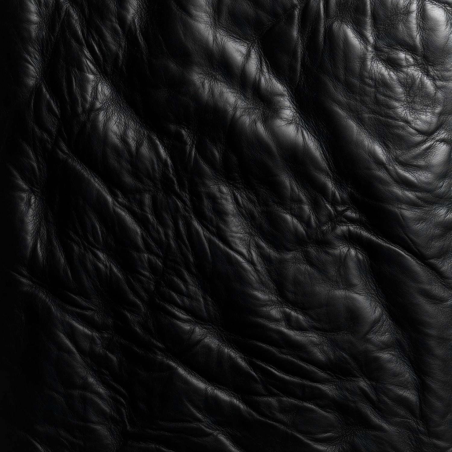Close-up of black leather texture with natural wrinkles and glossy highlights, showcasing its rich grain and organic imperfections.