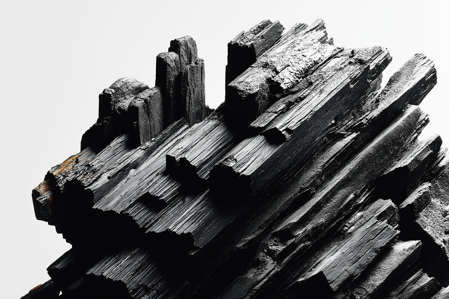 Close-up of a textured black mineral with sharp, jagged edges and a glossy surface, set against a light background for contrast.