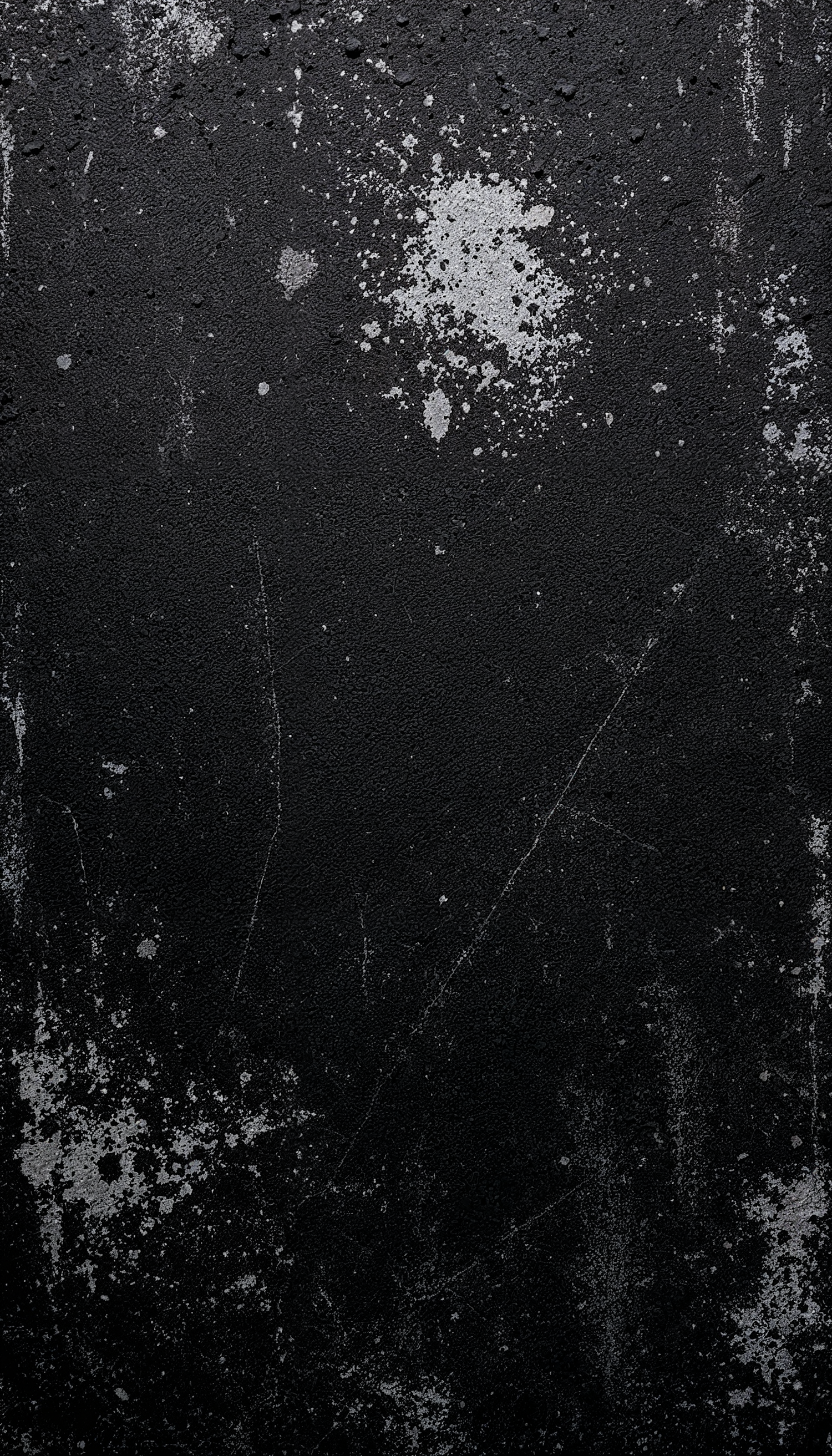Textured black surface with white speckles and scratches, creating an industrial and gritty appearance.