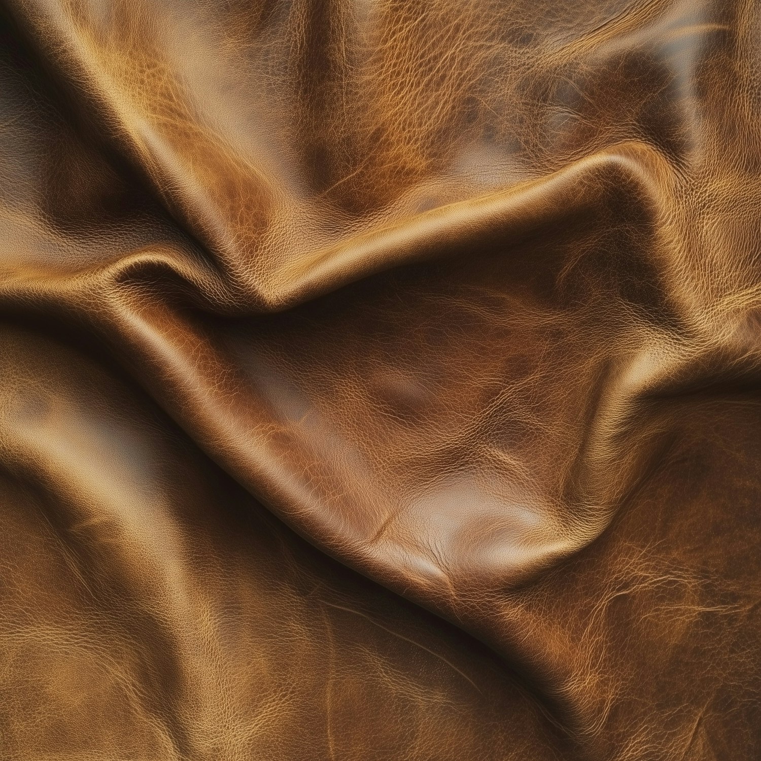 Rich brown leather close-up with natural creases and a slightly distressed texture, showcasing its warm tones and authentic quality.