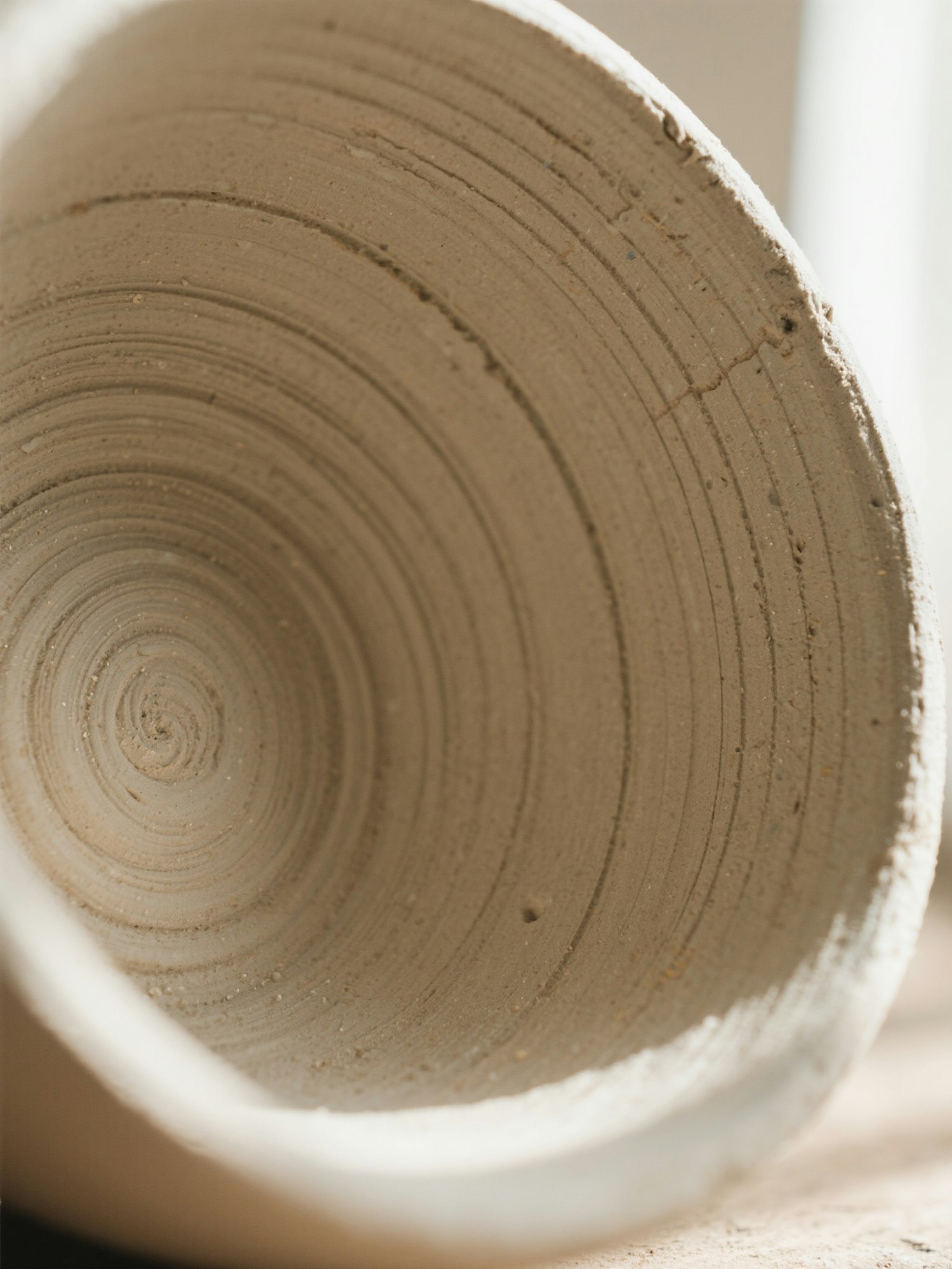 highly realistic photography, rustic handcrafted ceramics, natural daylight, soft shadows, minimal composition, textured clay surfaces, authentic artisanal atmosphere, calm and organic aesthetic, editorial product photography style. Extreme close-up inside a clay cup, beige matte surface with concentric grooves left by the pottery wheel, focus on circular texture.