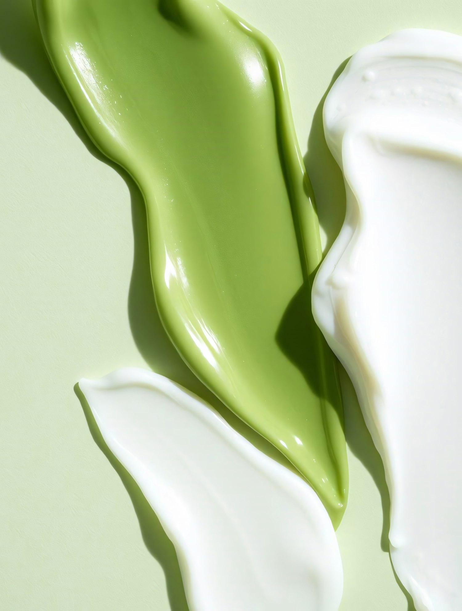 Close-up of green and white creams spread artistically on a light green background, showcasing their textures and glossy appearance.
