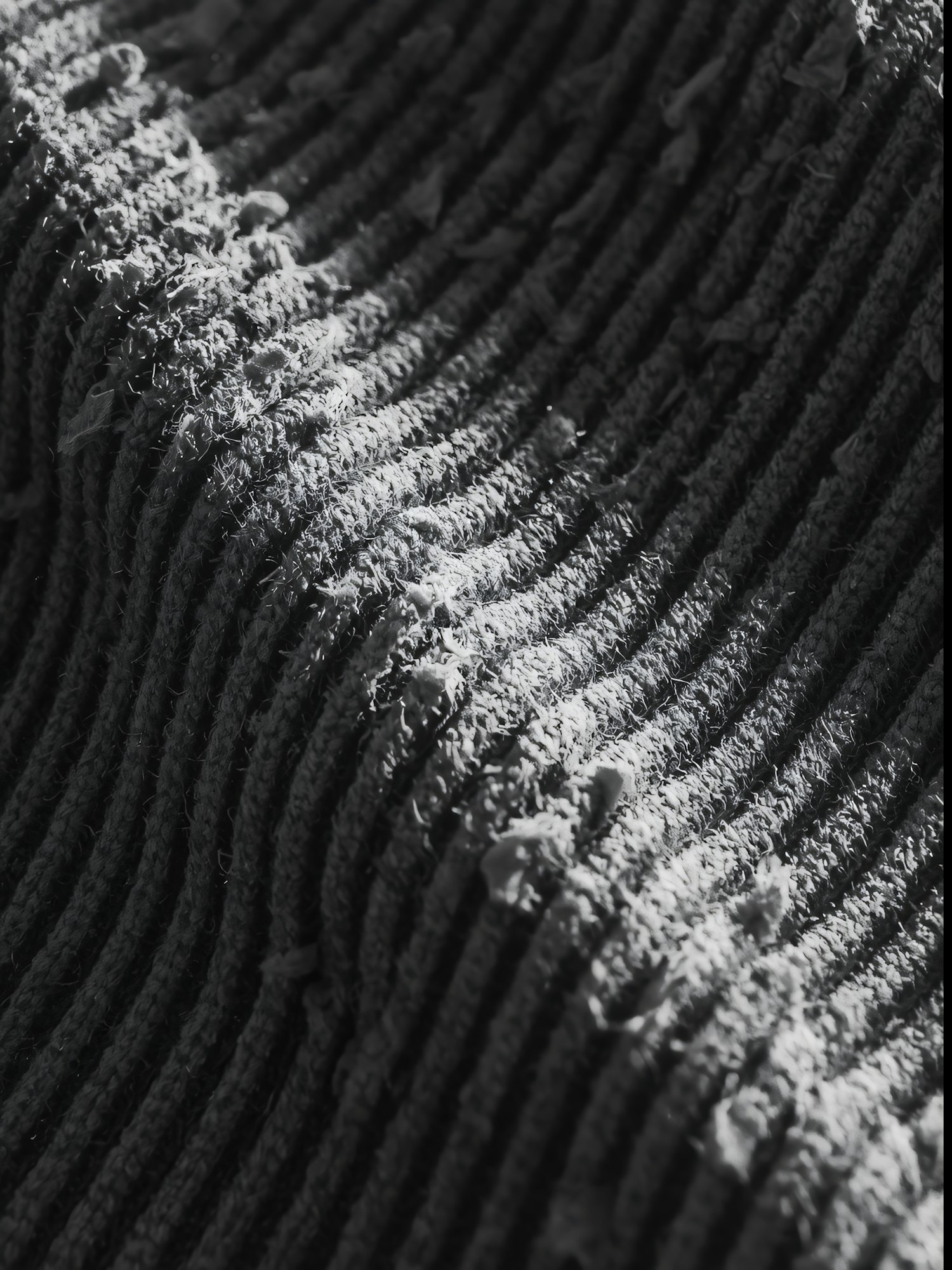 Close-up of a ribbed fabric texture with visible wear and pilling, highlighted by dramatic lighting and shadows.