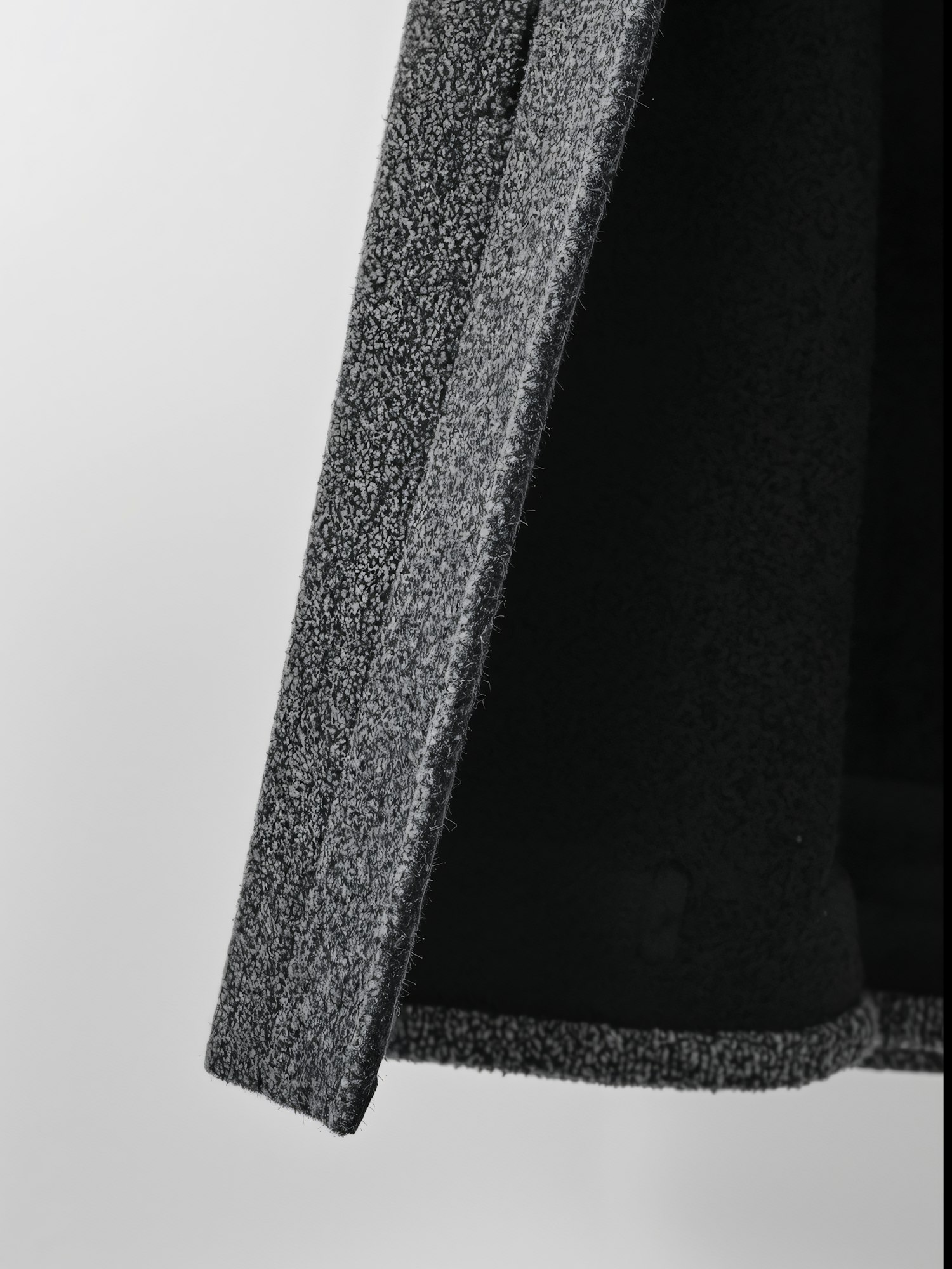 Close-up of a textured gray fabric edge with a speckled pattern, showcasing its detailed weave and soft surface against a neutral background.