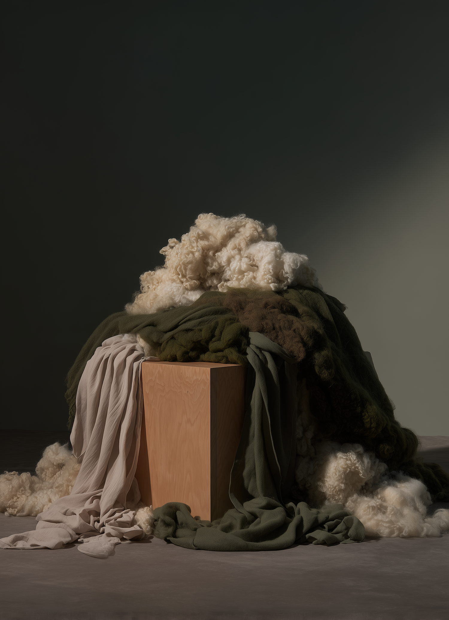 A wooden block adorned with soft wool and green and beige fabrics, creating a minimalist and earthy aesthetic with dramatic lighting.