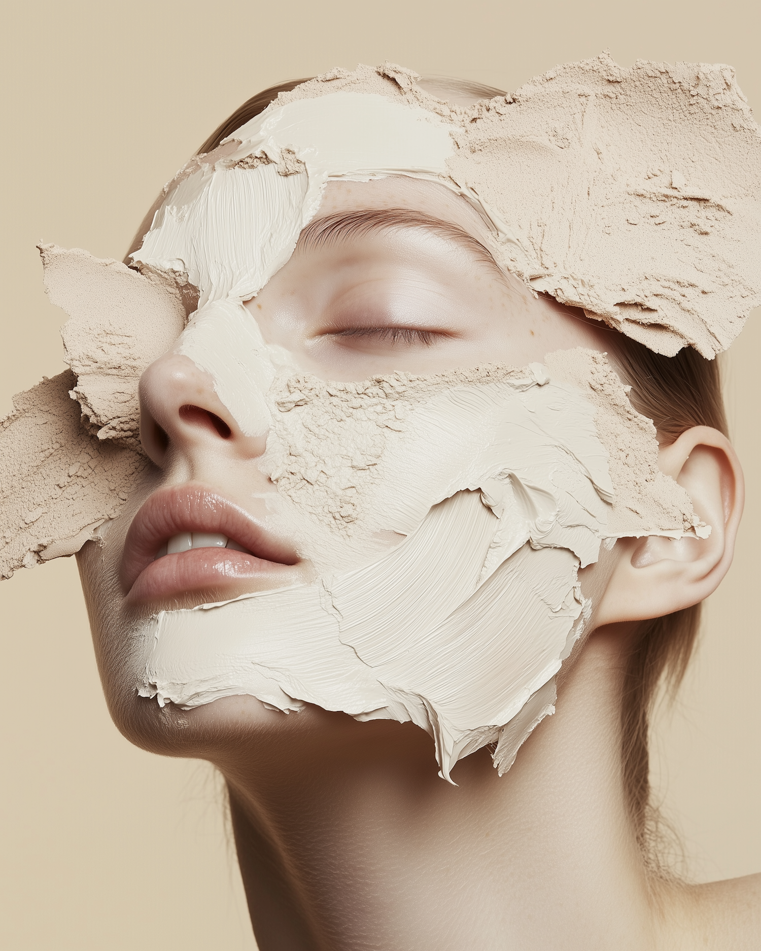 Close-up of a serene face with artistic clay mask application, highlighting texture and contrast against a neutral background.