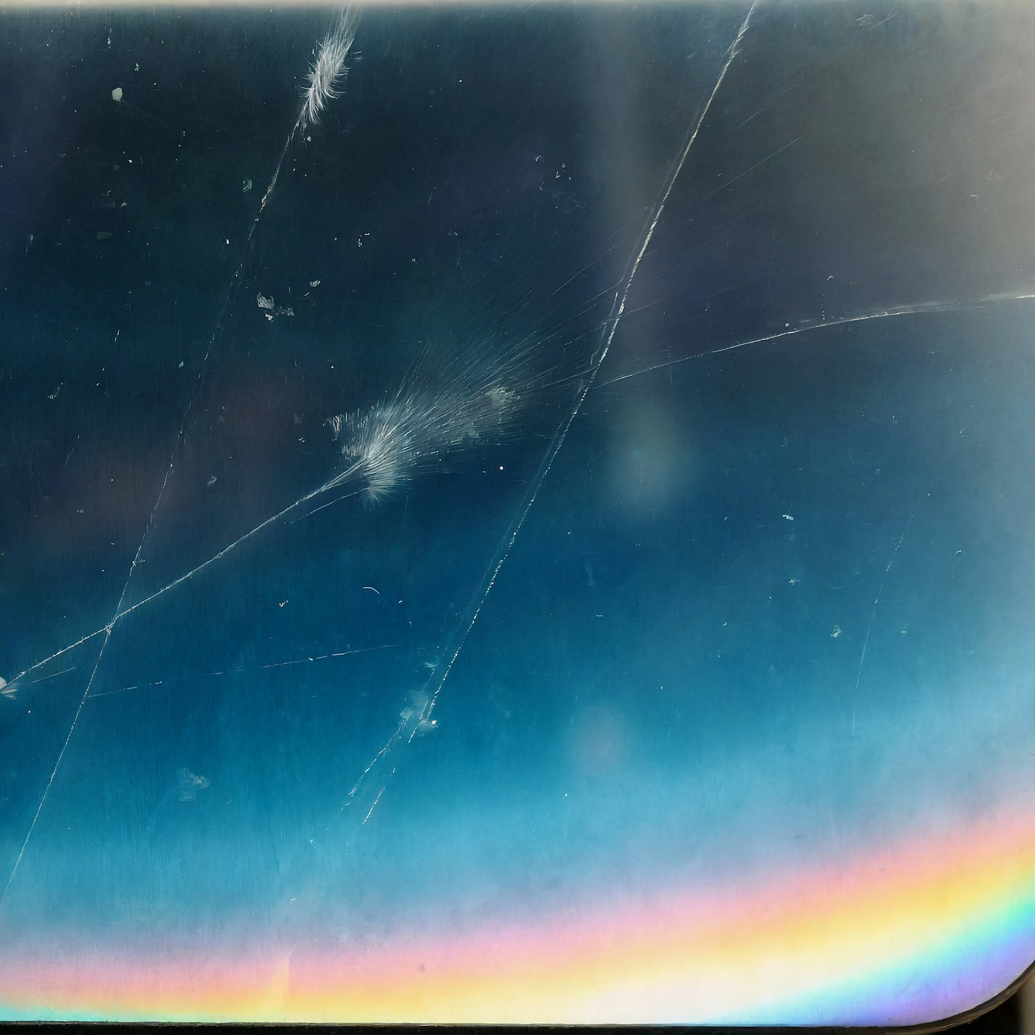 Close-up of a scratched surface with a blue to rainbow gradient, featuring intersecting scratches and scuffs.