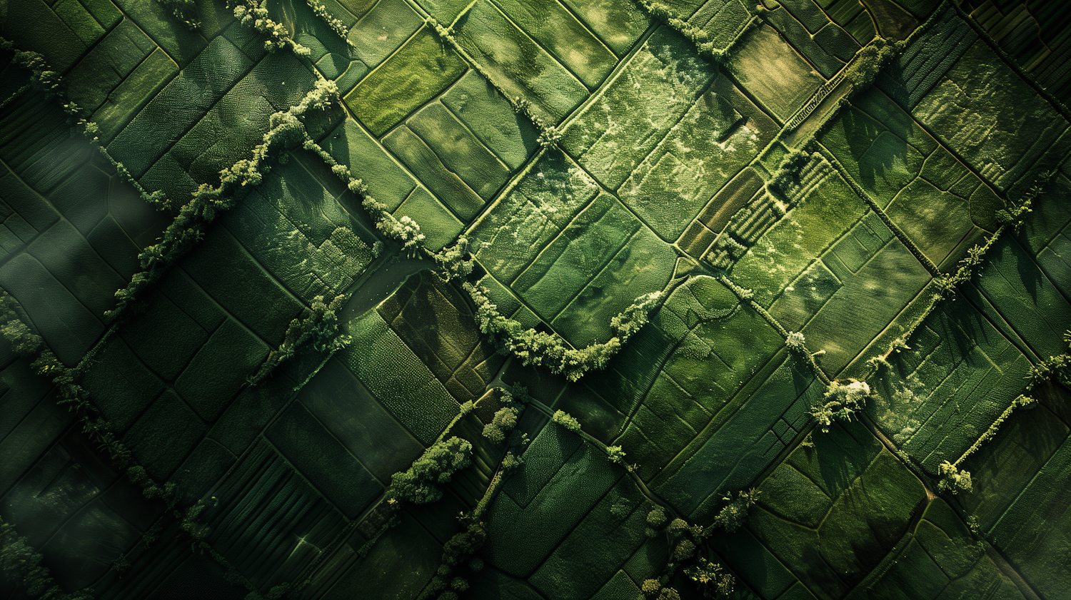 Aerial view of lush green fields with tree-lined paths creating a patchwork pattern, showcasing nature's vibrant textures and colors.