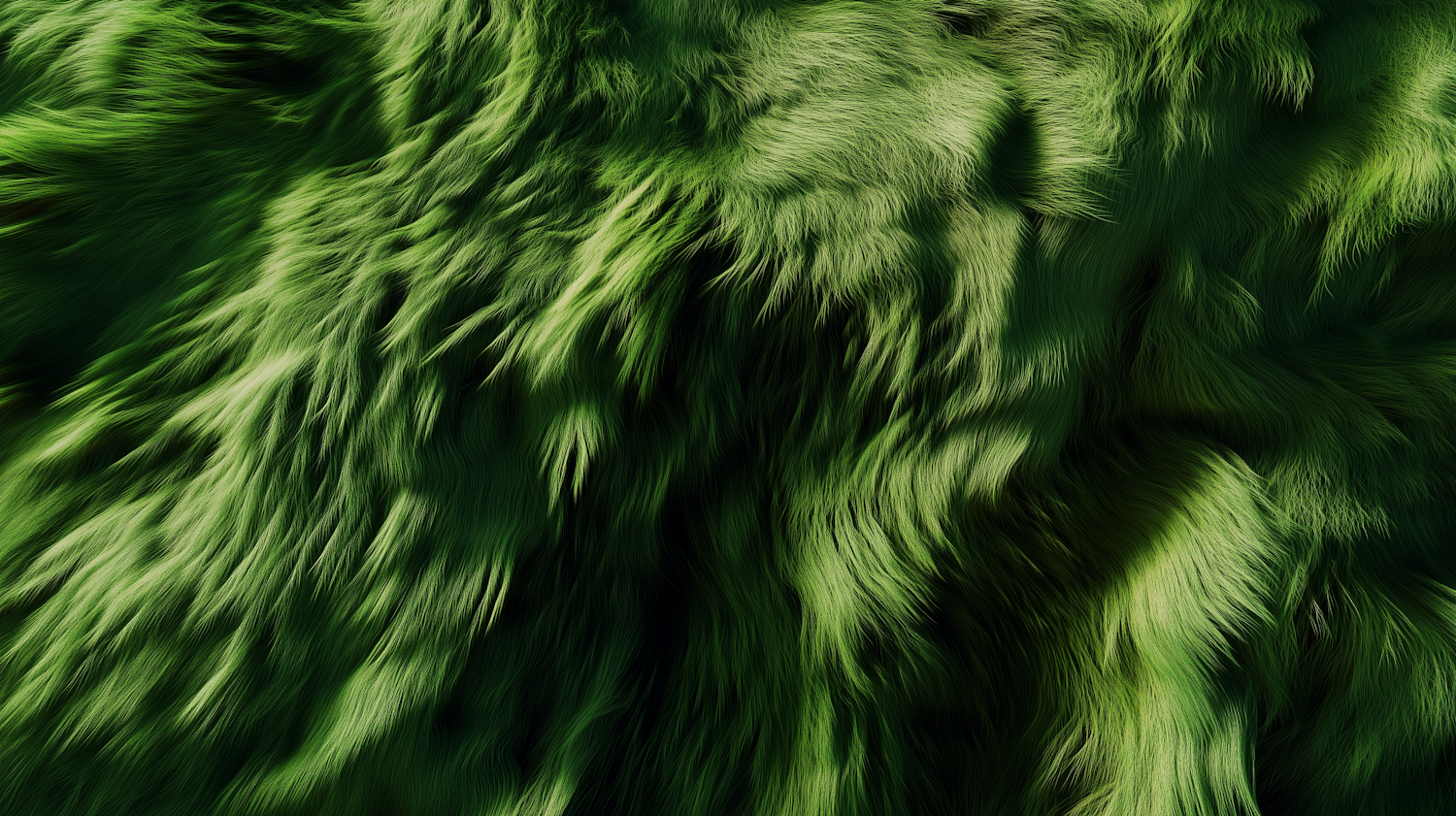 A close-up of green fur-like texture with dynamic lighting, showcasing intricate details and a natural flow.