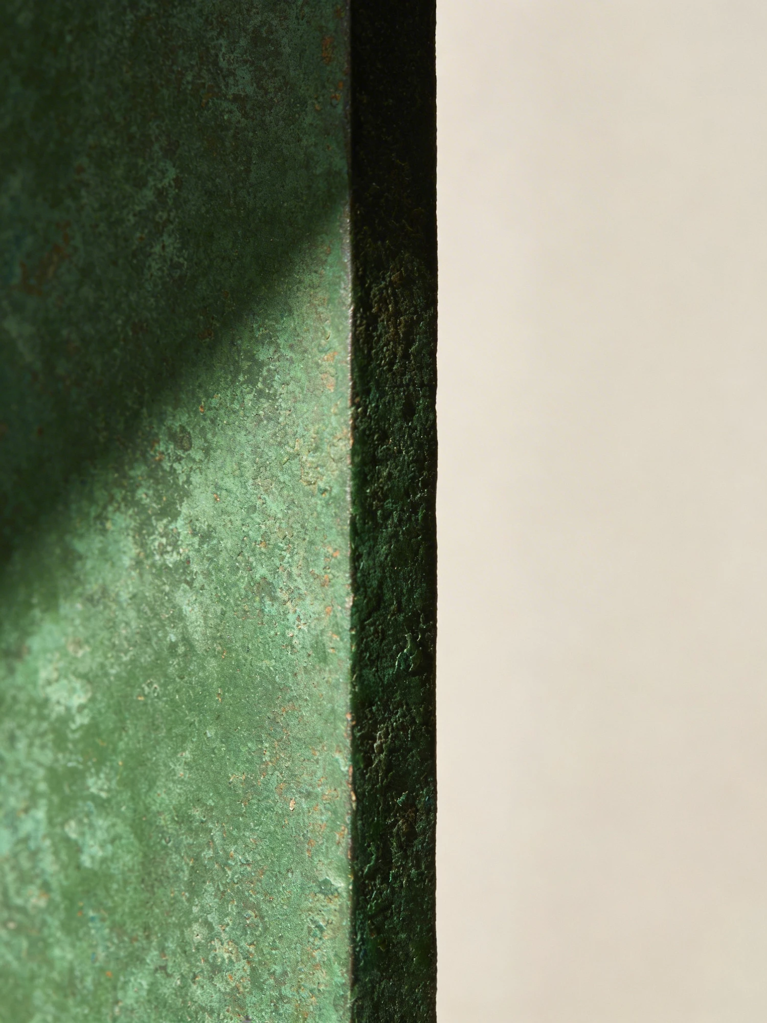 Close-up of a textured green patina surface with light and shadow interplay, set against a neutral beige background.