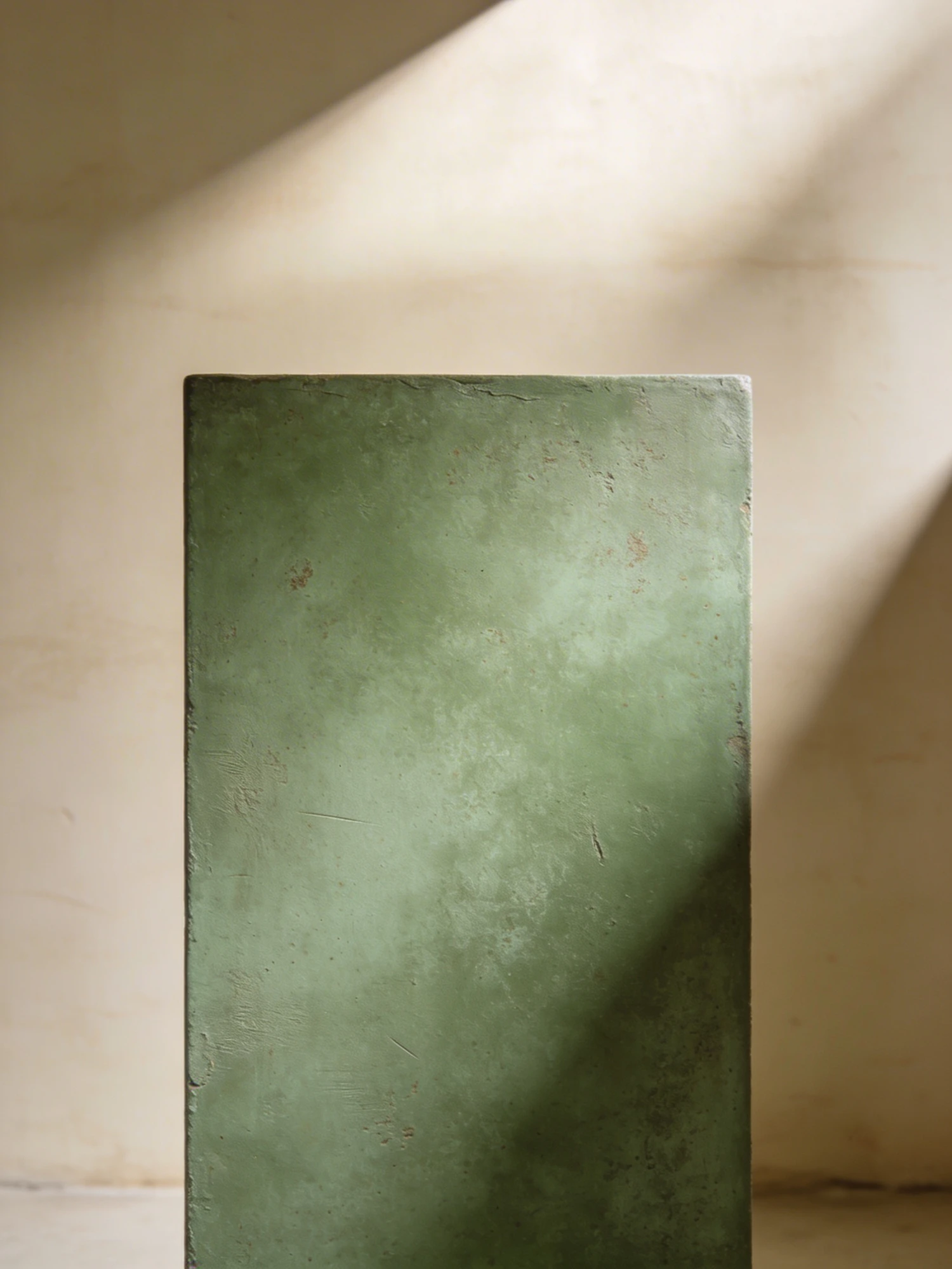 A textured wall with subtle patina and soft lighting, centered composition, plain background tone that complements the green.