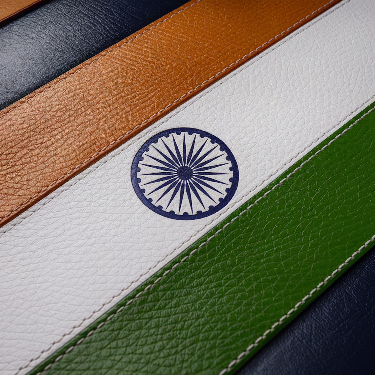 Close-up of the Indian flag design on a textured leather surface, featuring saffron, white, green stripes, and a blue Ashoka Chakra.
