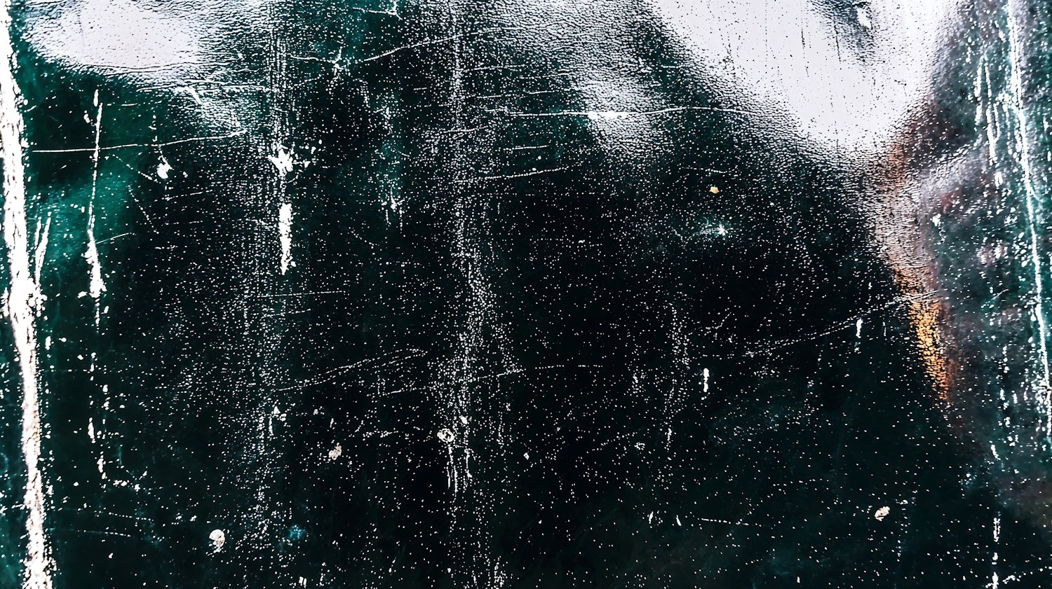 A close-up of a scratched, glossy dark green surface with white highlights and scattered specks, creating a distressed and industrial look.
