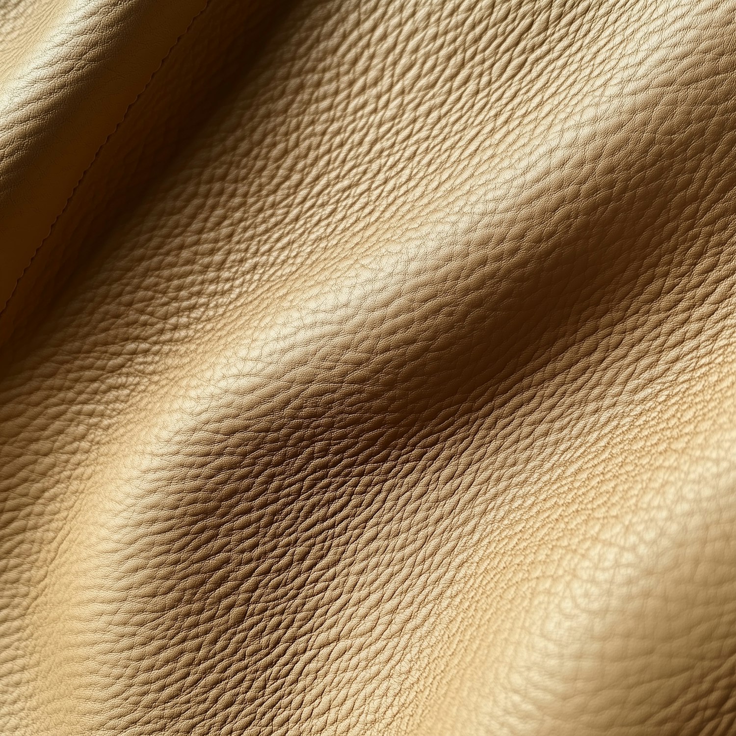 Close-up of beige leather texture with natural grain and soft lighting, showcasing its detailed wrinkles and luxurious appearance.