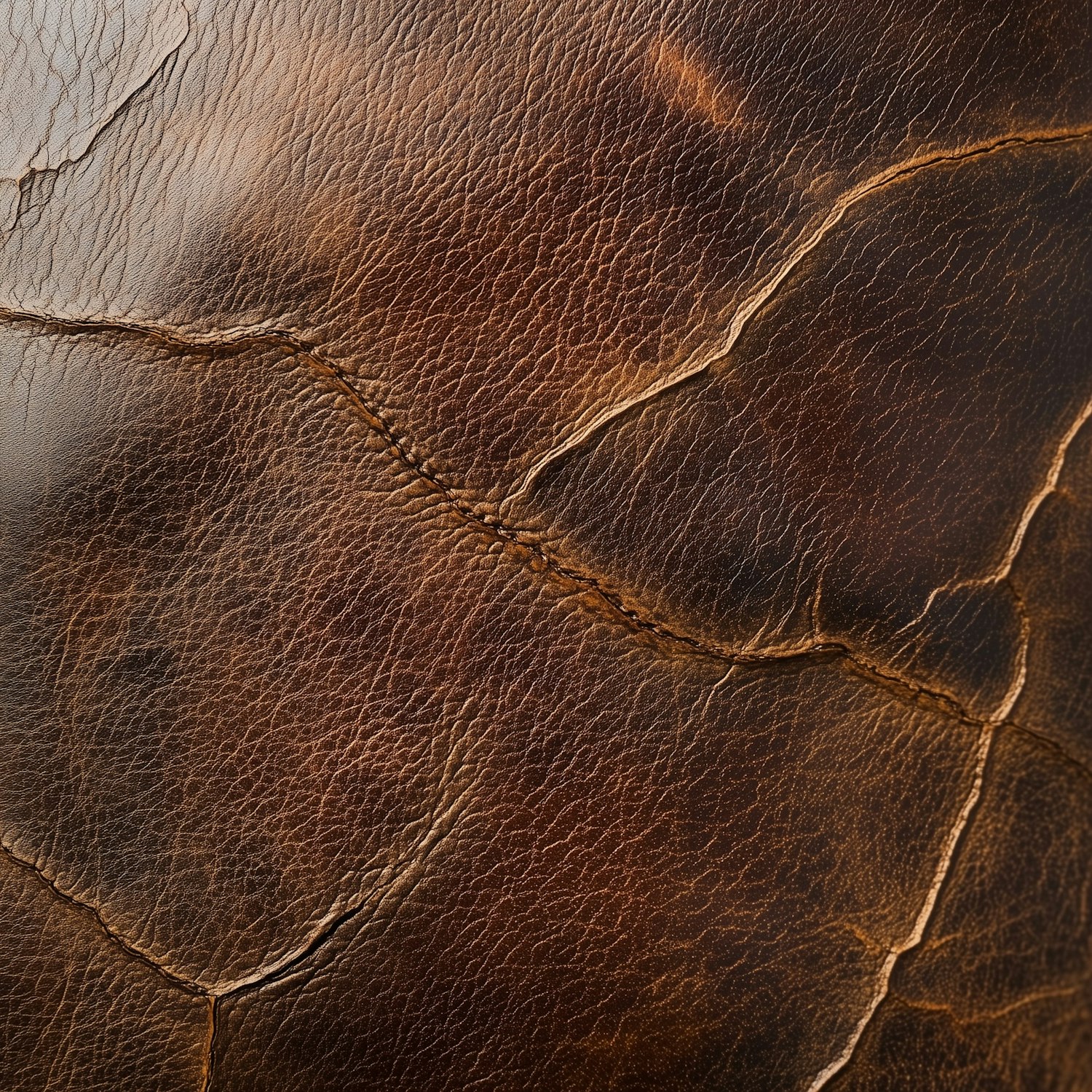 Close-up of textured brown leather with creases and natural imperfections, showcasing a rugged, vintage aesthetic.