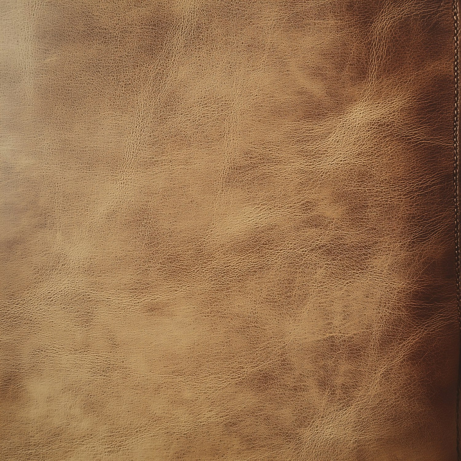 Close-up of textured brown leather with visible grain, creases, and a stitched seam on the right edge, showcasing rustic craftsmanship.