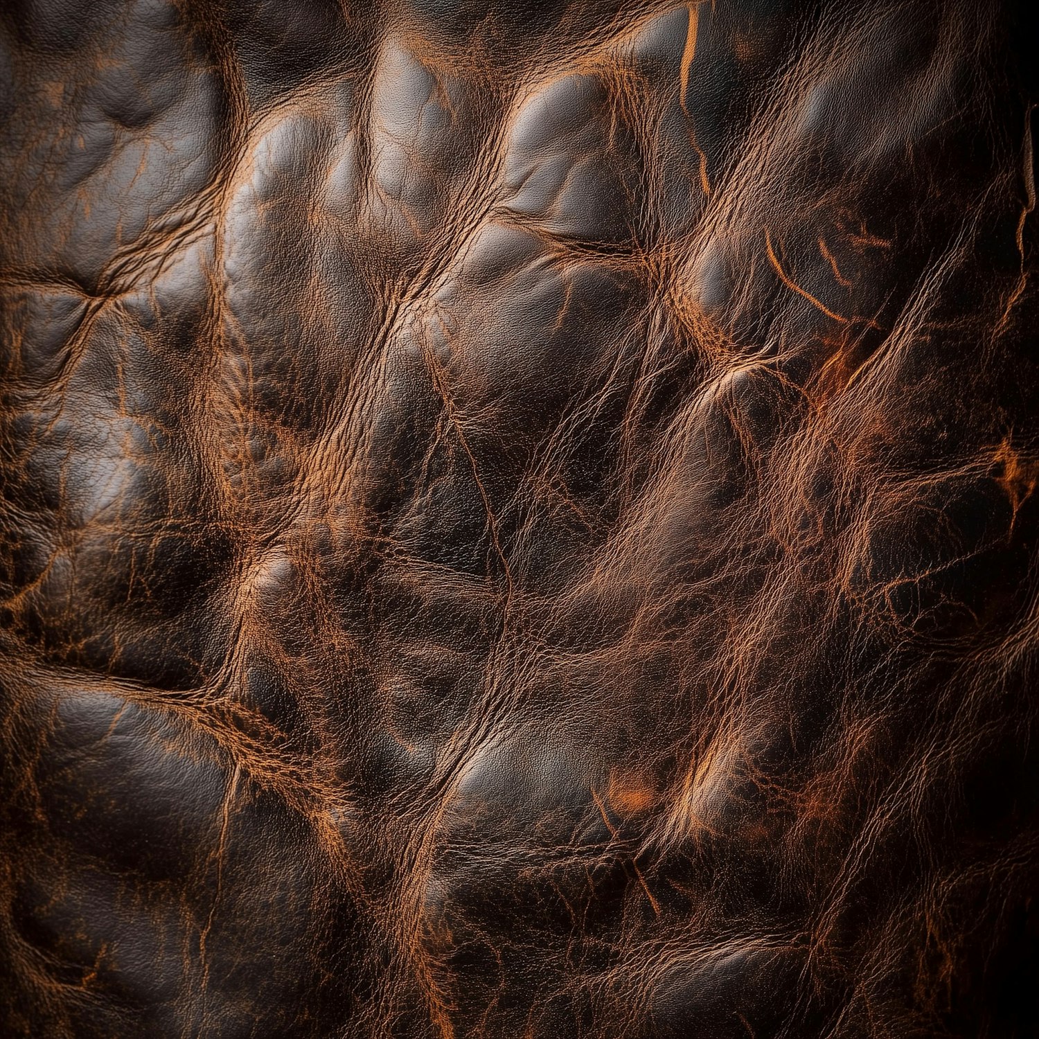 Close-up of textured brown leather with creases and natural imperfections, showcasing its aged and rugged appearance.