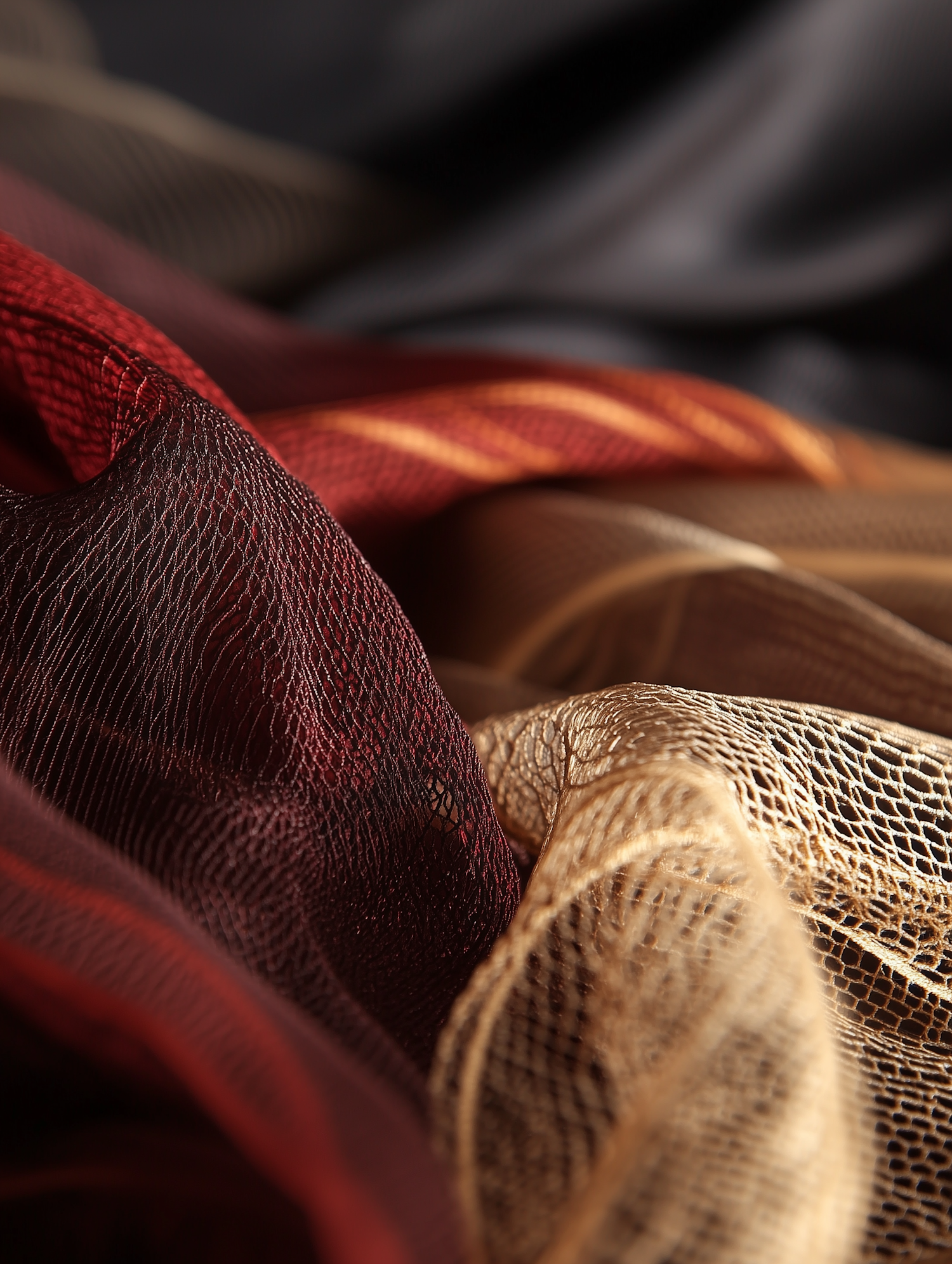 Close-up of textured mesh fabric in red, gold, and black tones, showcasing intricate patterns and dynamic folds under soft lighting.