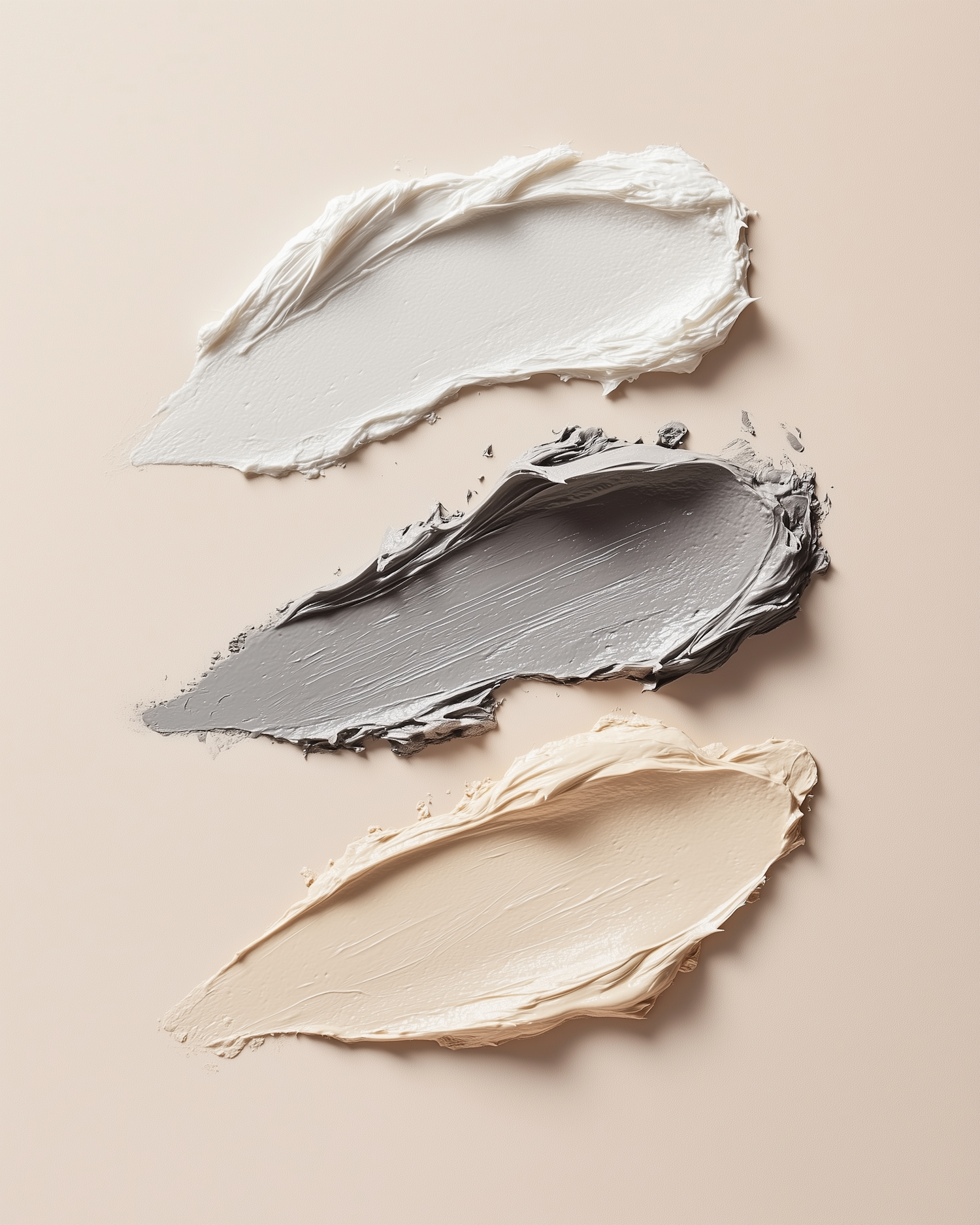 Three textured paint smears in white, gray, and beige on a neutral background, showcasing color contrast and texture.