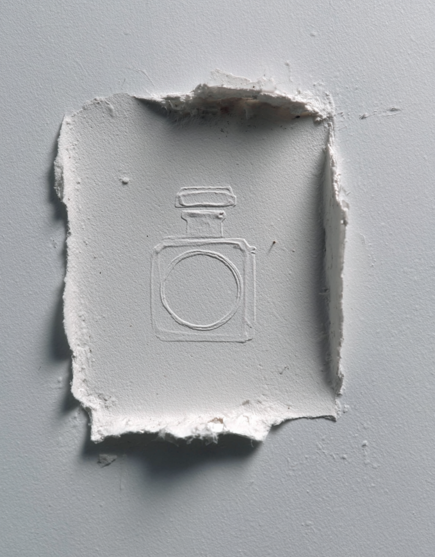 Embossed perfume bottle design on a torn white textured surface, creating a minimalist and artistic visual.