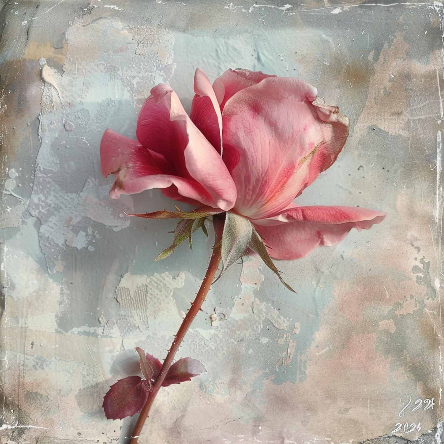 A delicate pink rose against a textured, abstract background with muted colors, blending natural beauty and artistic expression.