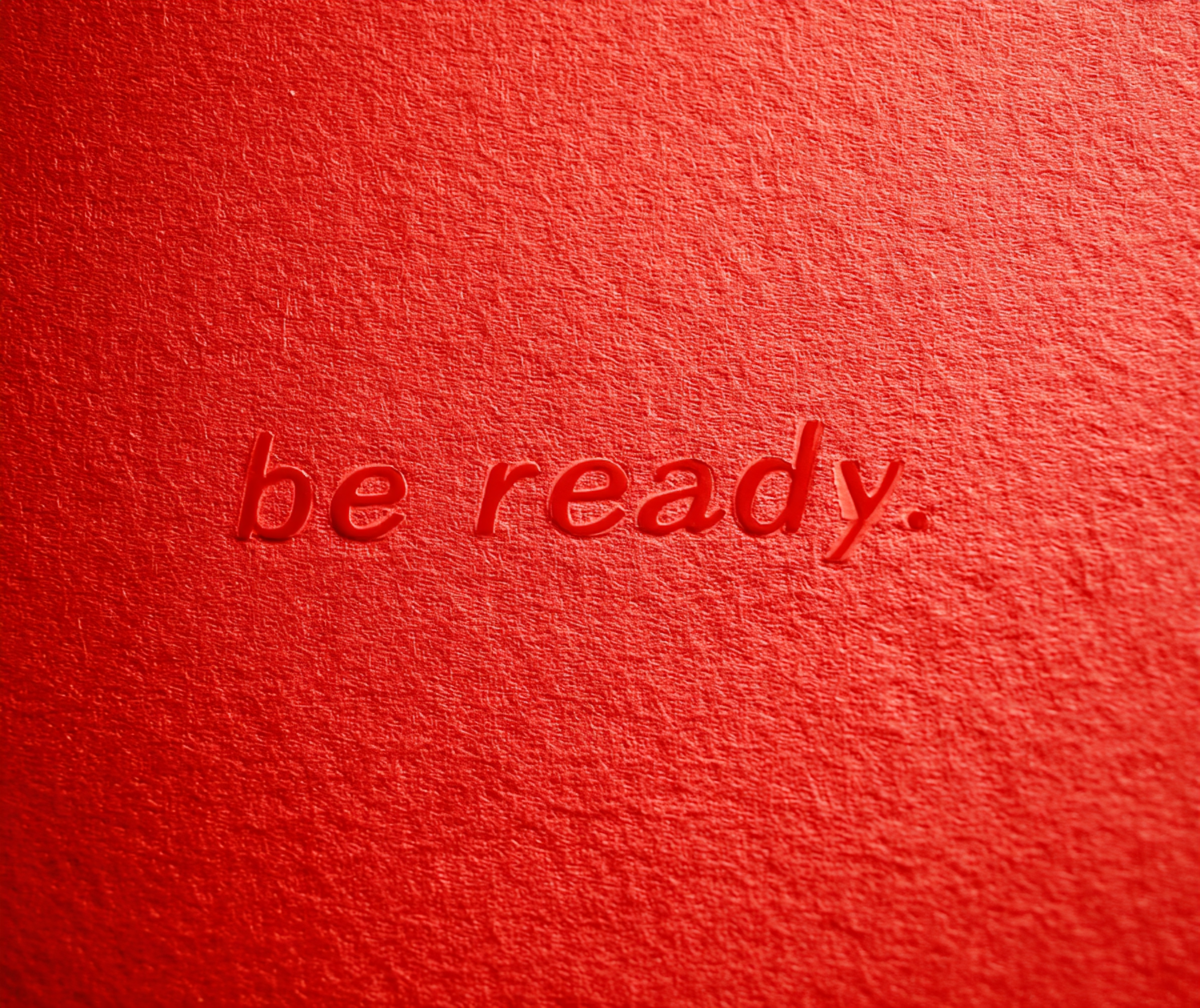 A textured red surface with the phrase 'be ready.' embossed in darker red, creating a bold and minimalist visual statement.