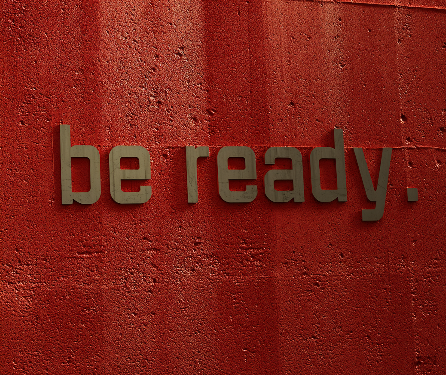 A bold 'be ready.' message in metallic letters on a textured red wall, creating a striking and motivational visual.