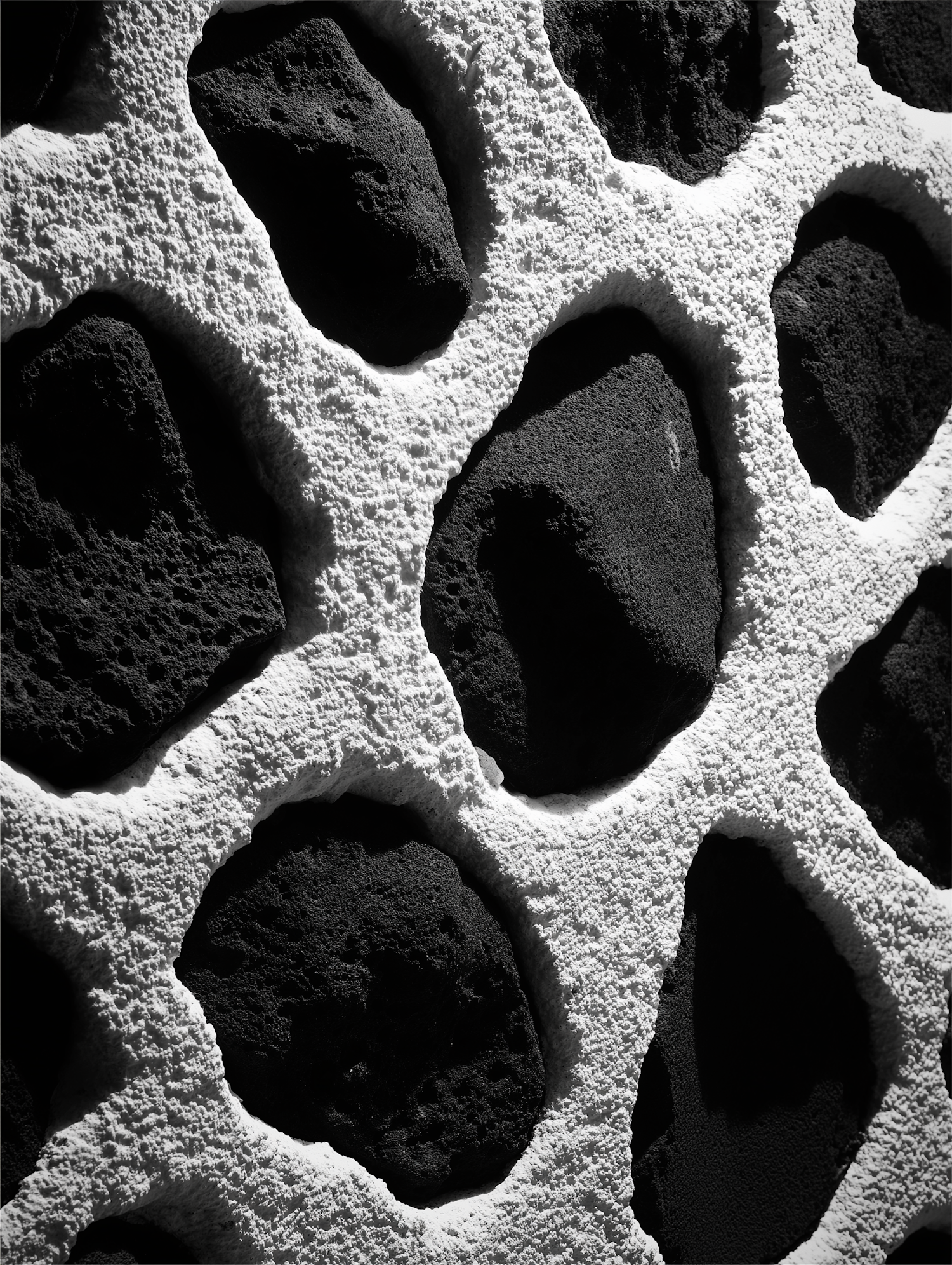 Close-up of dark porous rocks embedded in a white textured matrix, showcasing striking contrast and intricate surface details.