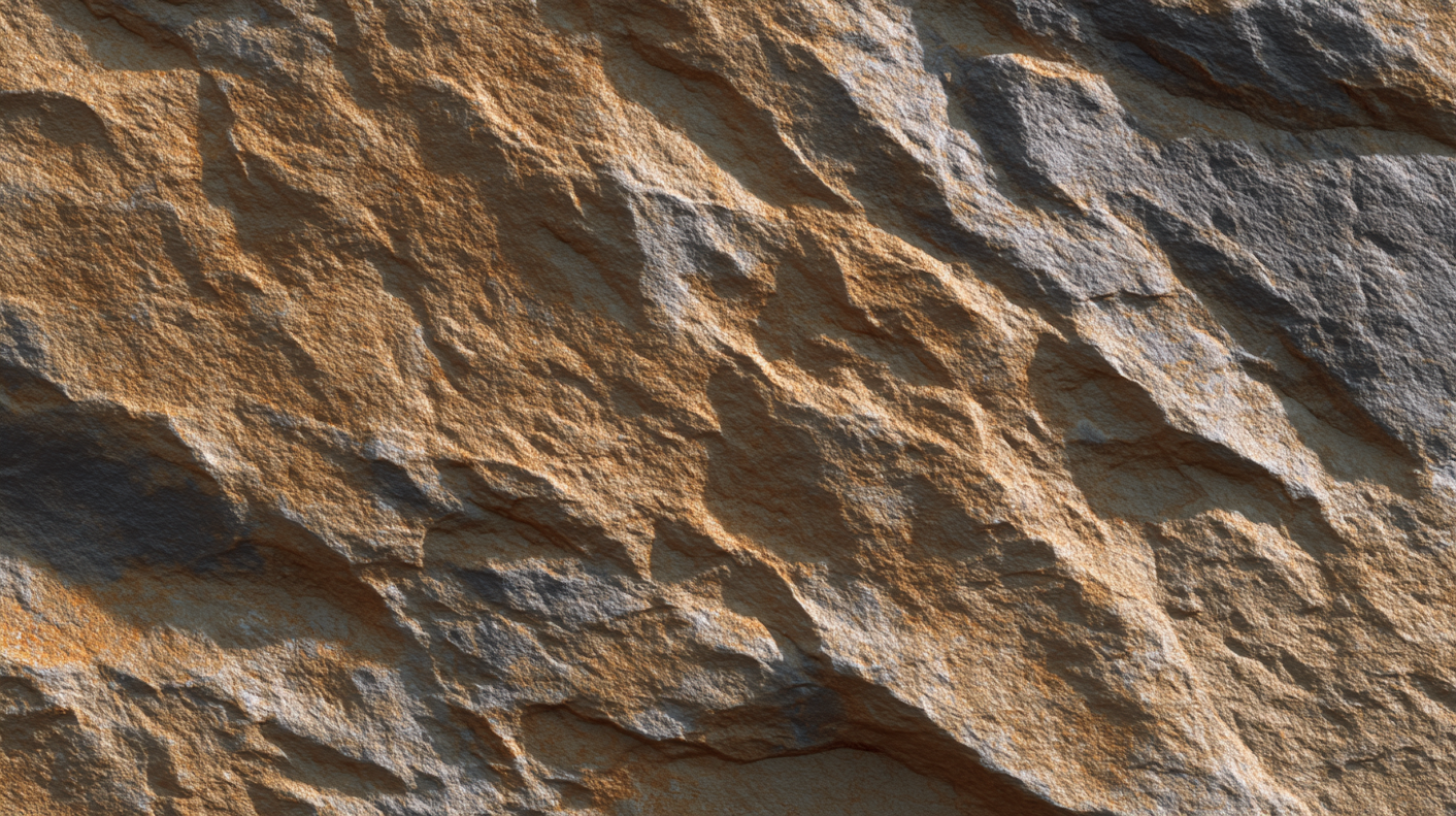Close-up of a rugged rock surface with warm orange and gray tones, showcasing natural textures and intricate details under dynamic lighting.