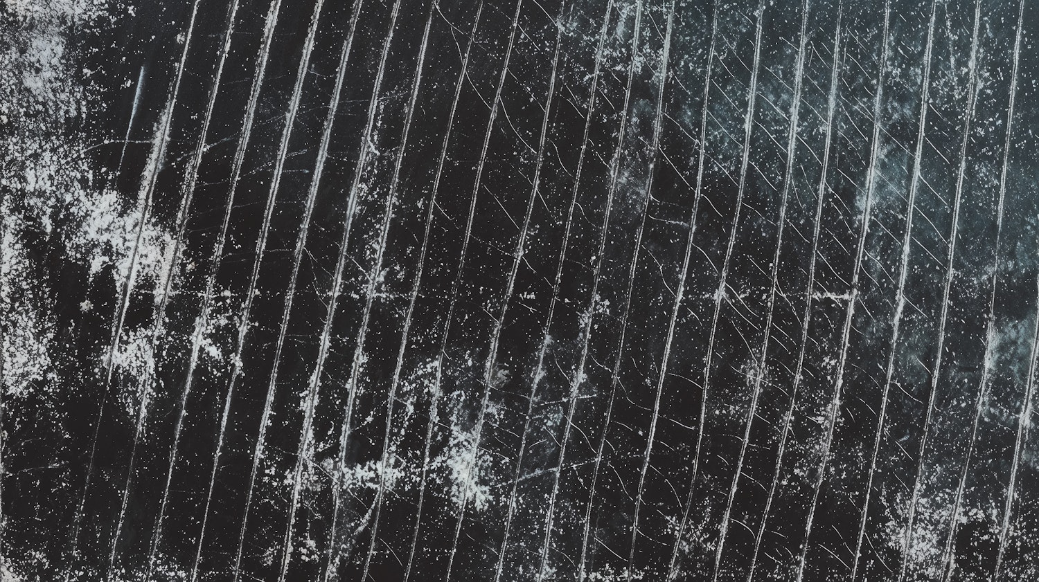 A dark textured surface with diagonal white scratches and scattered specks, resembling frost or wear on a metallic or glass material.