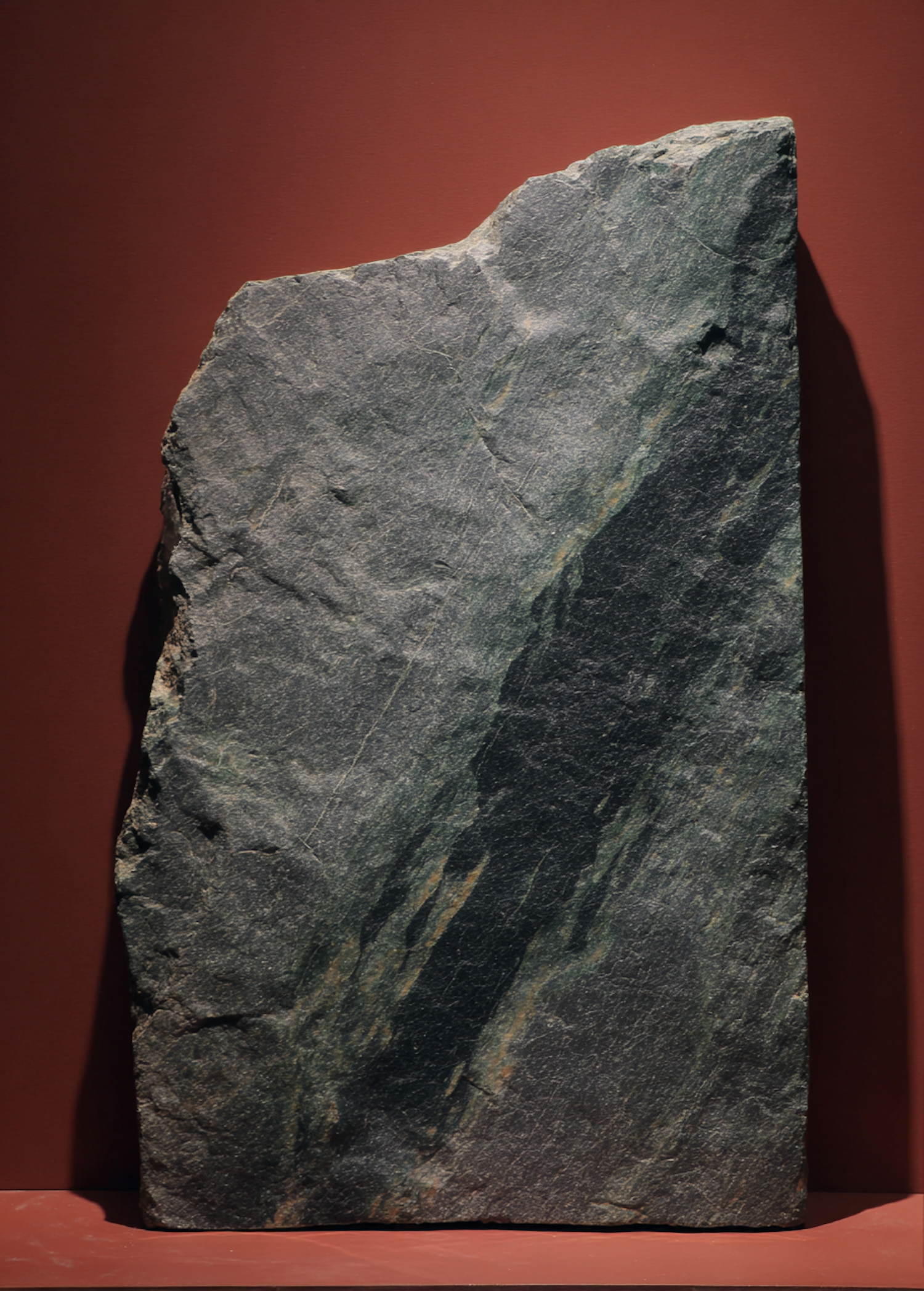 A textured dark stone slab with greenish hues and striations, displayed against a reddish-brown background, possibly in a museum.