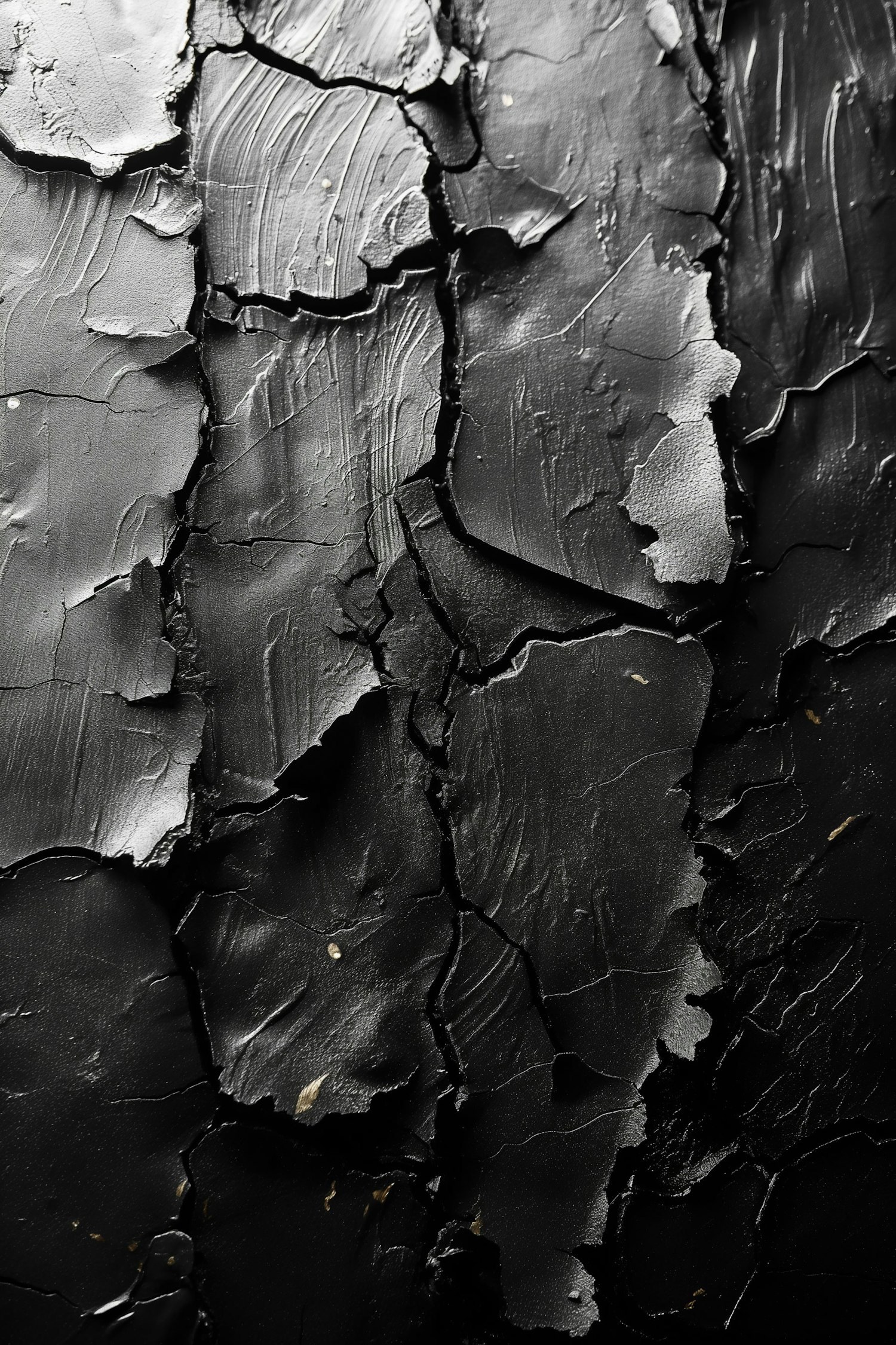 Close-up of cracked black paint with glossy texture and intricate patterns, highlighting depth and abstract design.