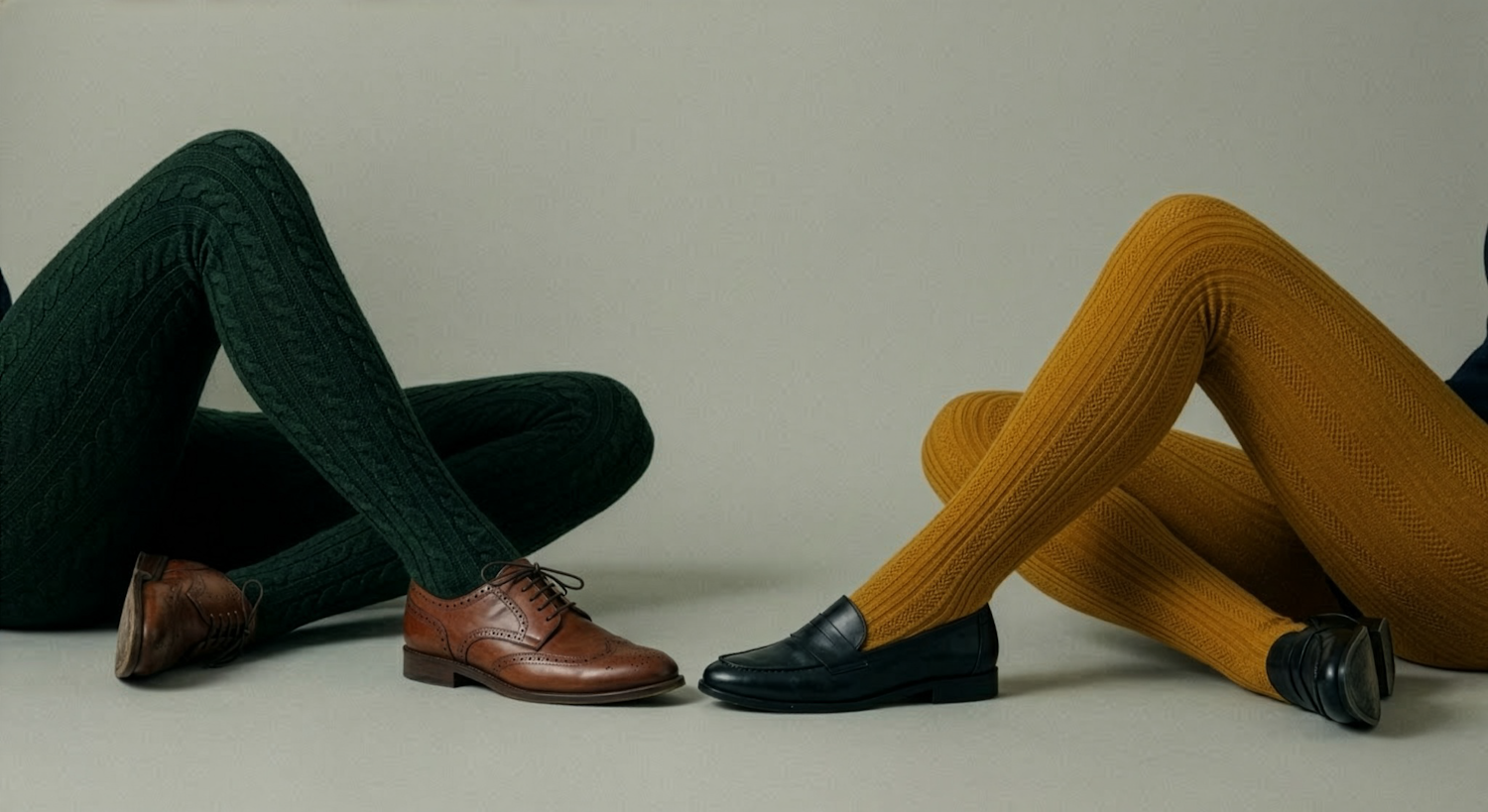Two individuals showcase stylish textured tights in green and mustard yellow, paired with brown brogues and black loafers, against a neutral backdrop.