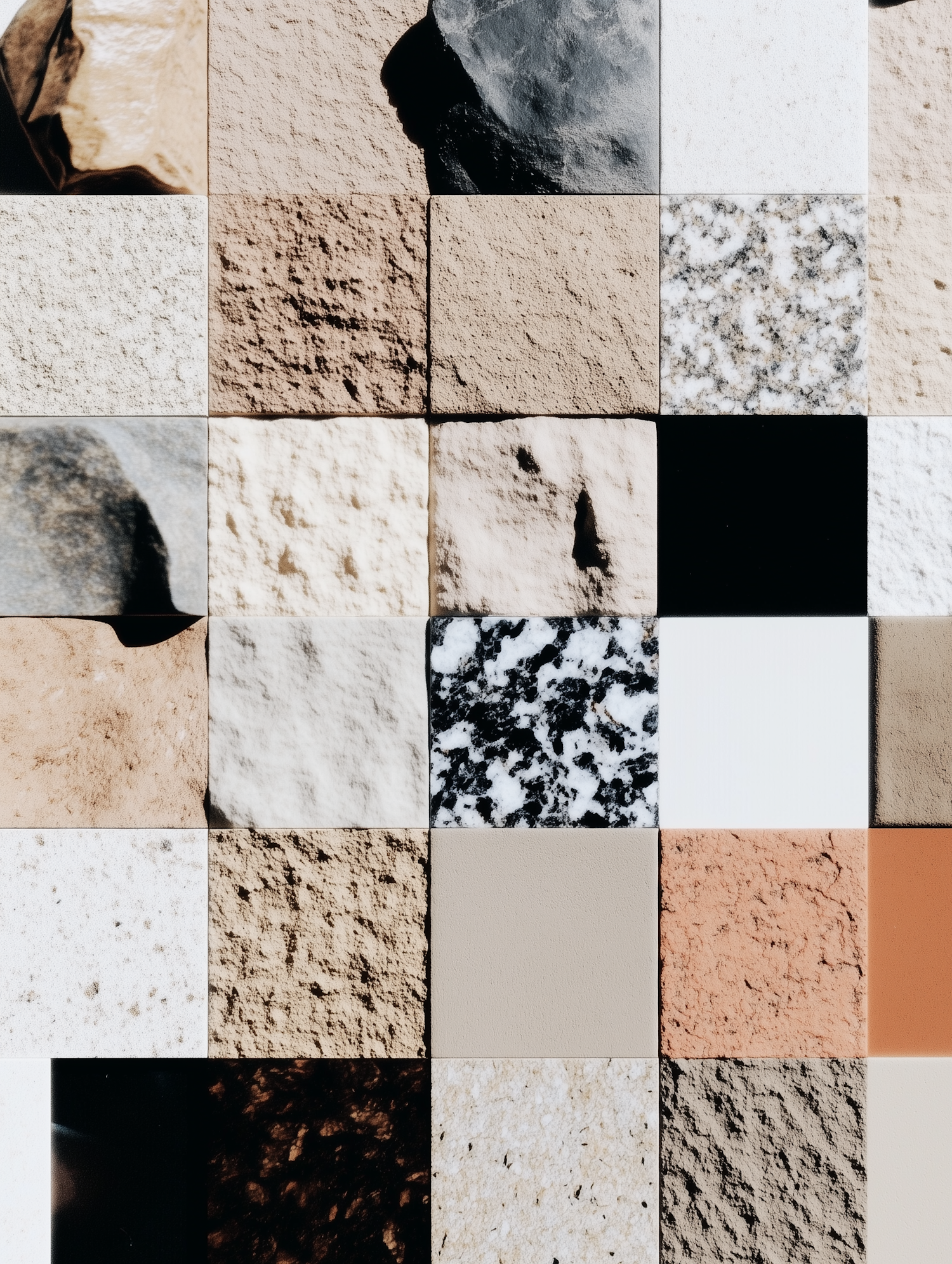 A grid of textured tiles in various colors and patterns, including stone and ceramic, arranged in a mosaic style.