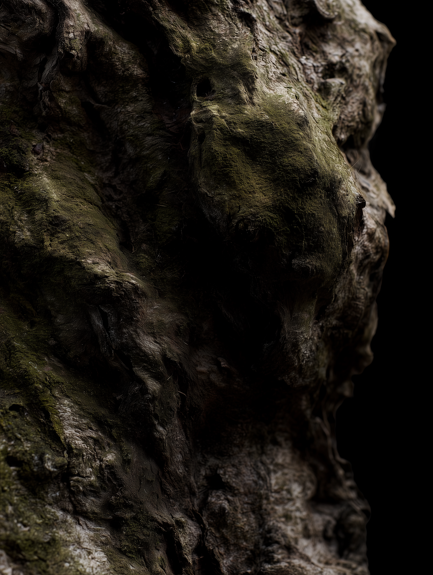 Close-up of rugged tree bark with moss and lichen, showcasing intricate textures and earthy tones against a dark background.