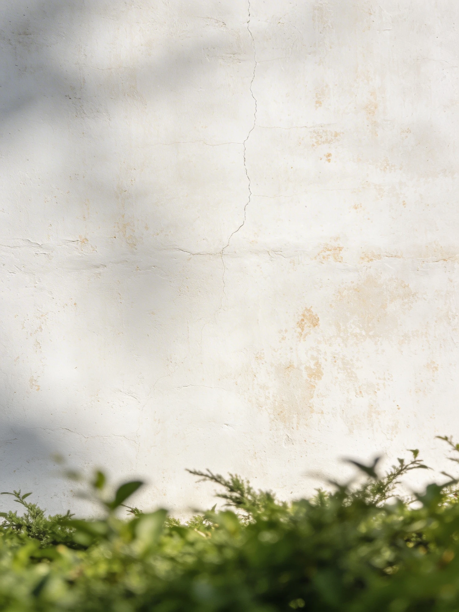 A weathered white wall with cracks and green foliage in the foreground, creating a serene and textured visual contrast.