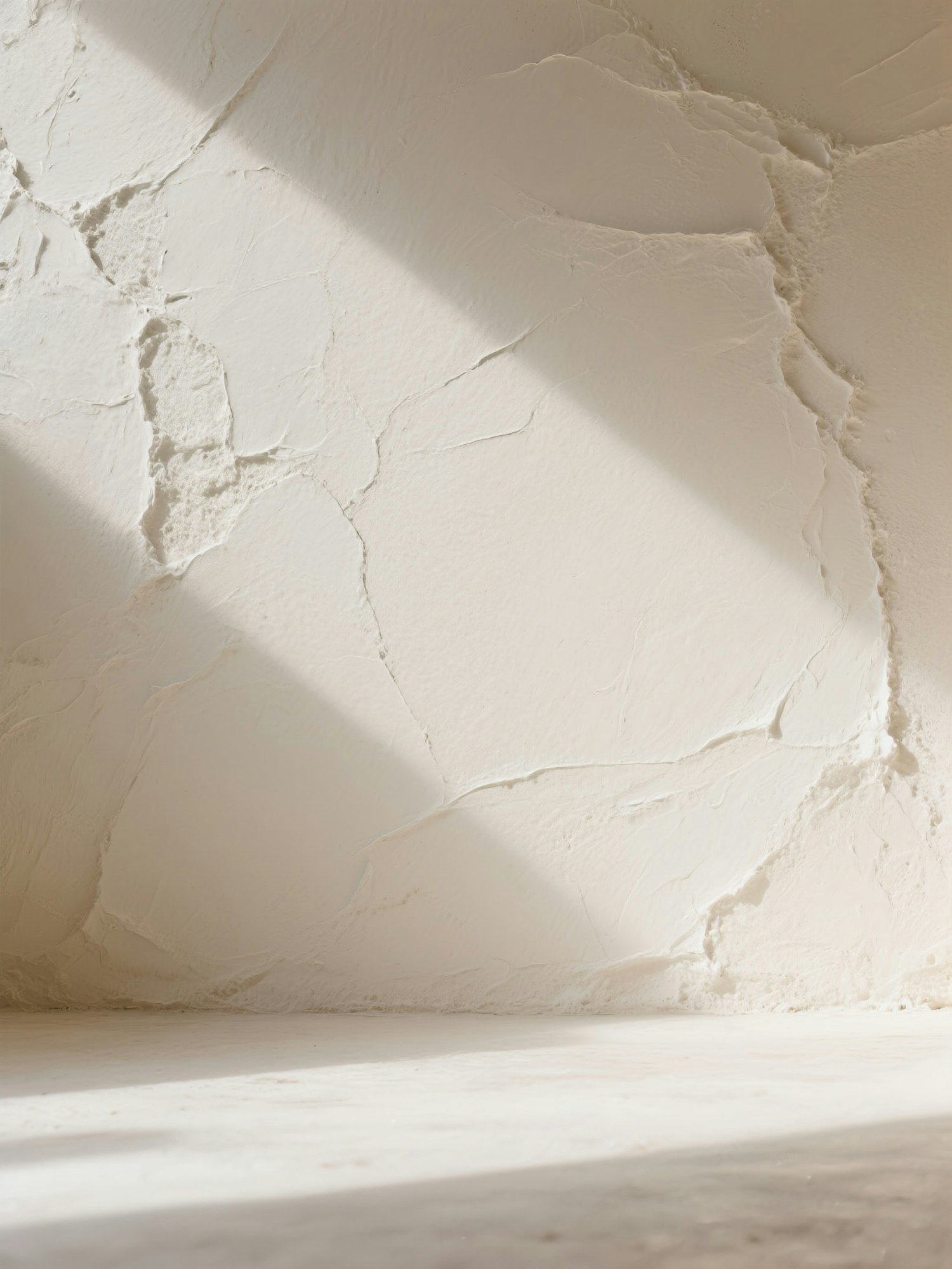 A textured beige wall with cracks illuminated by soft sunlight, creating a minimalist and serene aesthetic with natural shadows.