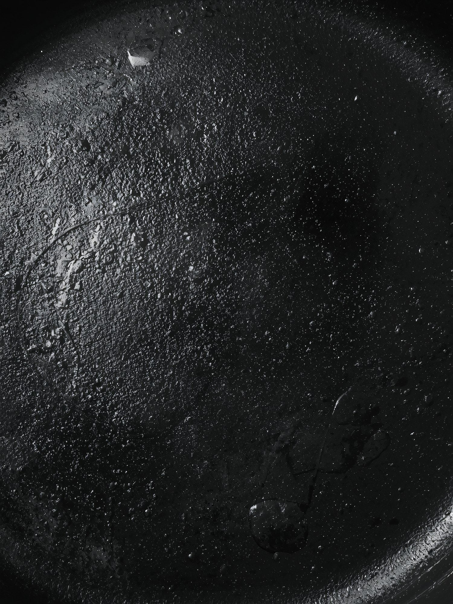 Close-up of a textured black surface with water droplets, showcasing a reflective and detailed finish under light.