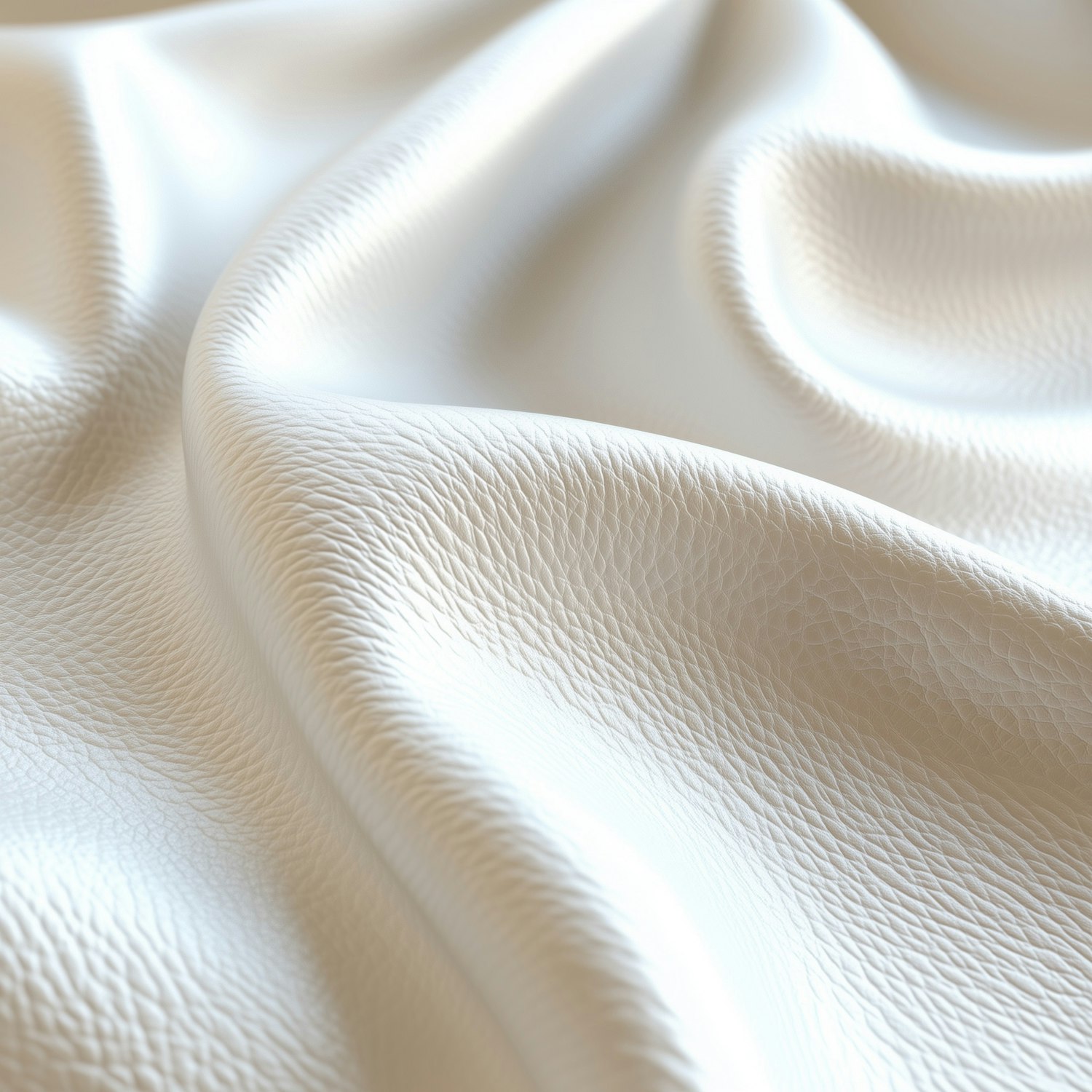 Close-up of textured white leather with soft folds and fine grain, showcasing its luxurious and supple appearance.