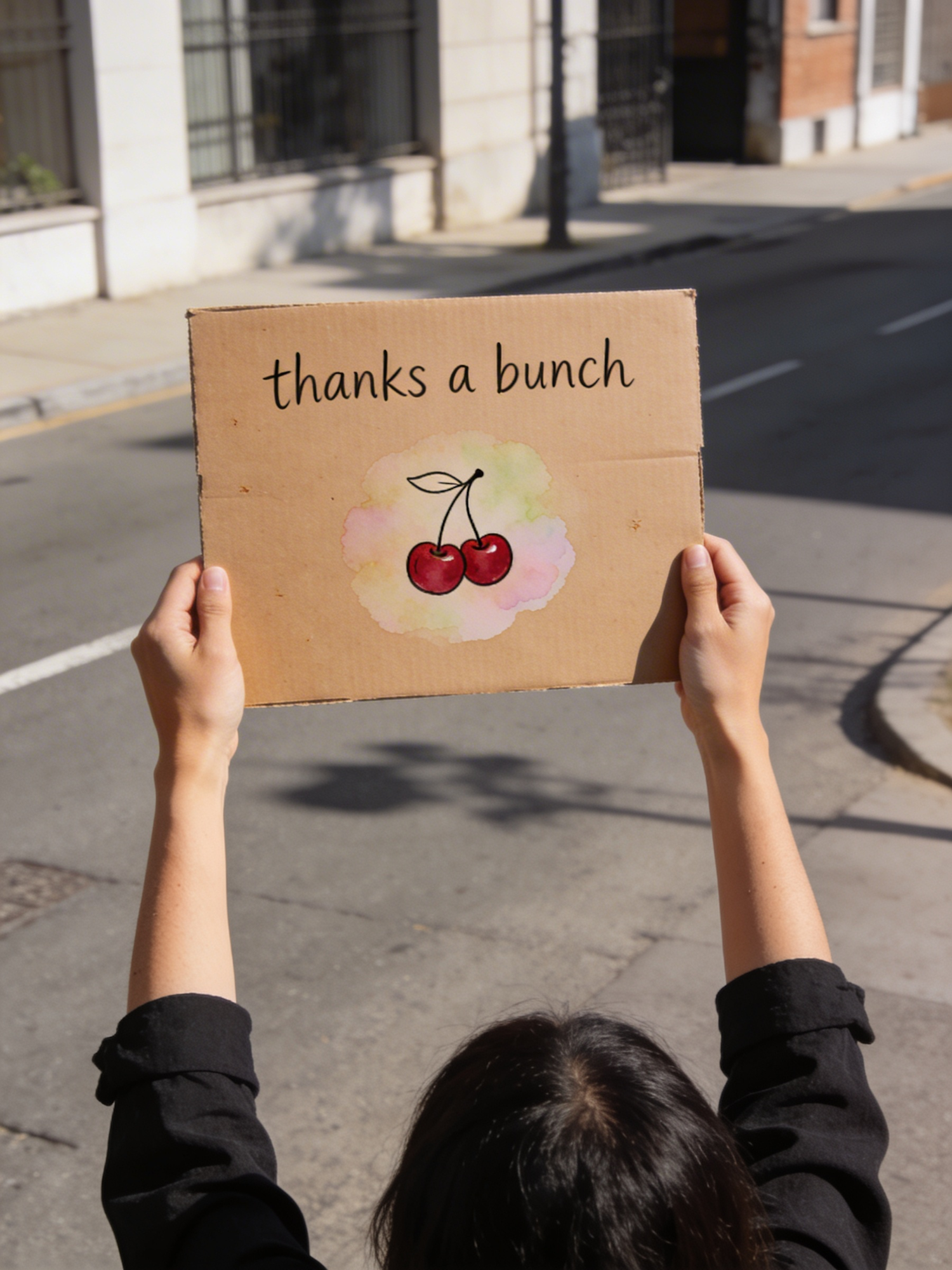 A person holds a cardboard sign reading 'thanks a bunch' with a cherry illustration, set against a sunny urban street backdrop.