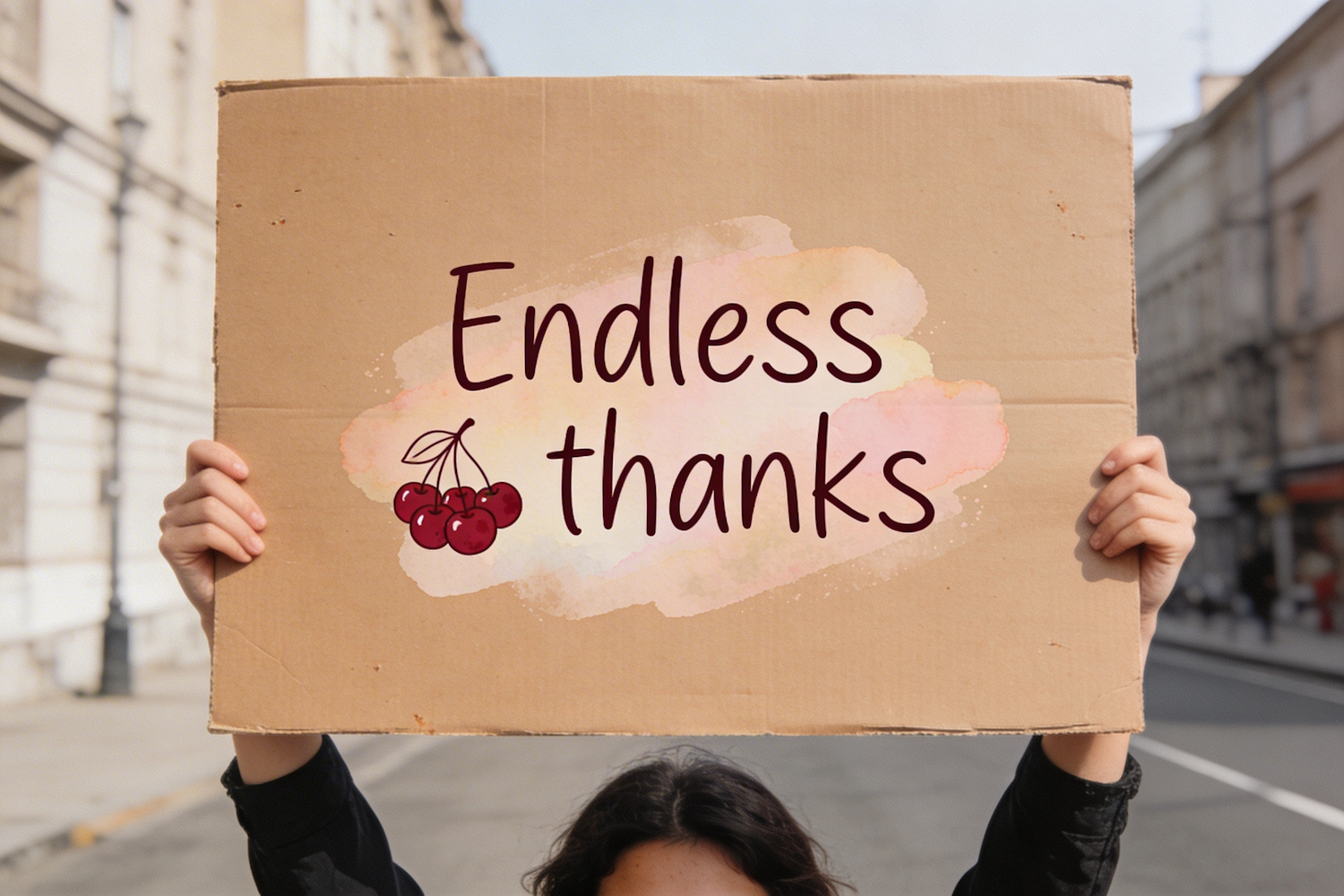 A high‑definition, realistic street‑style photo of a person standing outdoors on a quiet city street, holding a warm brown cardboard sign high above their head. The sign features hand‑drawn text that reads “Endless thanks” in simple, clean handwriting, along with a minimal line‑art illustration of a small bunch of cherries. Behind the cherries is a soft pastel watercolor wash, subtle and airy. The cardboard texture is natural and slightly worn. Soft natural daylight creates gentle shadows on the street and the person’s hands. The background is clean and uncluttered, with a neutral urban backdrop that keeps the focus on the sign. No extra text, no logos, no watermark — just a crisp, minimal, editorial‑style moment.