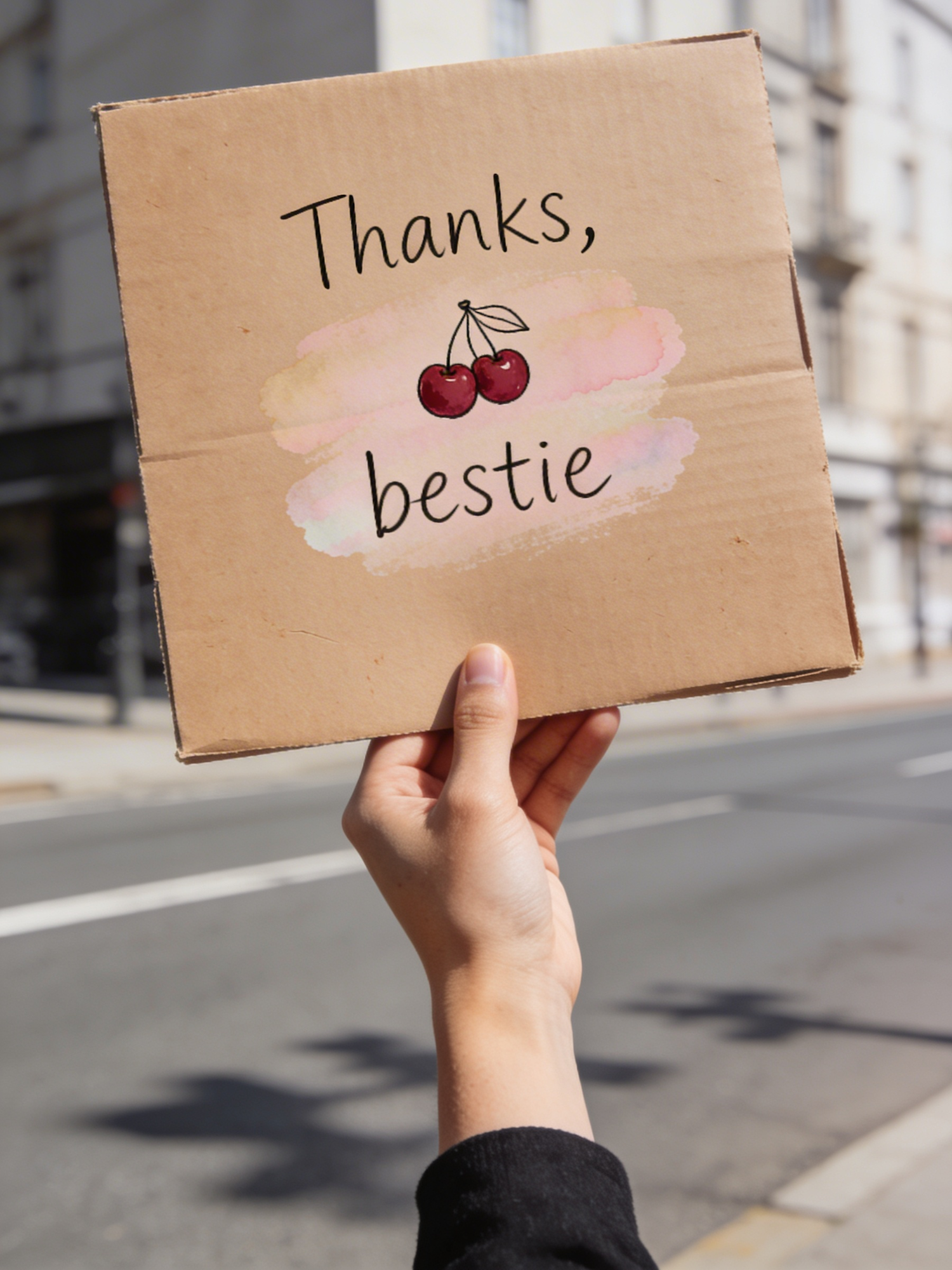 A hand holds a cardboard sign reading 'Thanks, bestie' with a cherry design, set against a blurred urban street background.